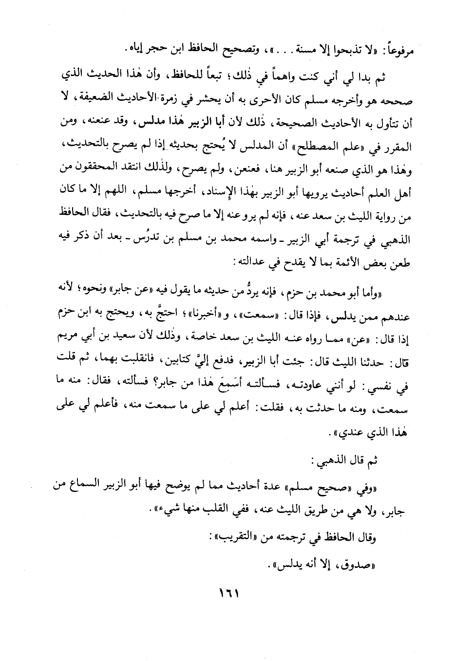ويحتج به ابن حزم إذا قال: عن مما رواه عنه الليث بن سعد خاصة، وذلك لأن سعيد بن أبي مريم قال: حدثنا الليث قال: جئت أبا الزبير، فدفع إلى كتابين، فانقلبت بهما، ثم قلت في نفسي: لو أننى عاودته فسألته أسمع هذا من جابر؟ فسألته، فقال: منه ما سمعت، ومنه ما حدثت به، فقلت: أعلم لي على ما سمعت منه، فأعلم لي على هذا الذي عندي، ثم قال الذهبي: وفي " صحيح مسلم " عدة أحاديث مما لم يوضح فيها أبو الزبير السماع من جابر، ولا هي من طريق الليث عنه، ففي القلب منها شيء، وقال الحافظ في ترجمته من " التقريب ": صدوق إلا أنه يدلس.