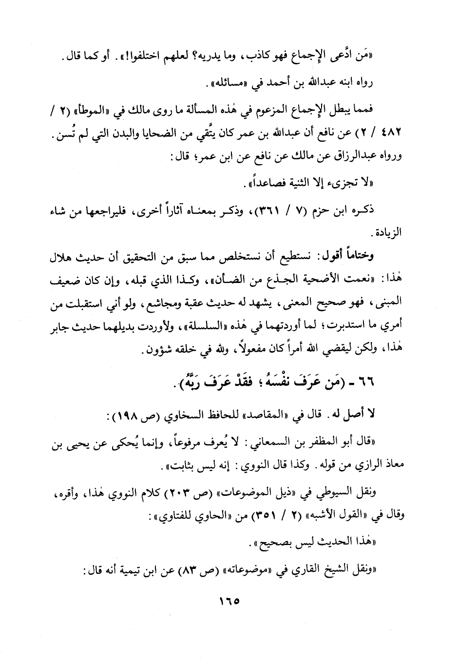 فمما يبطل الإجماع المزعوم في هذه المسألة ما روى مالك في " الموطأ " (2 /482 / 2) عن نافع أن عبد الله بن عمر كان يتقي من الضحايا والبدن التي لم تسن ورواه عبد الرزاق عن مالك عن نافع بن ابن عمر قال: " لا تجزيء إلا الثنية فصاعدا "، ذكره ابن حزم (7 / 361) وذكر بمعناه آثارا أخرى فليراجعها من شاء