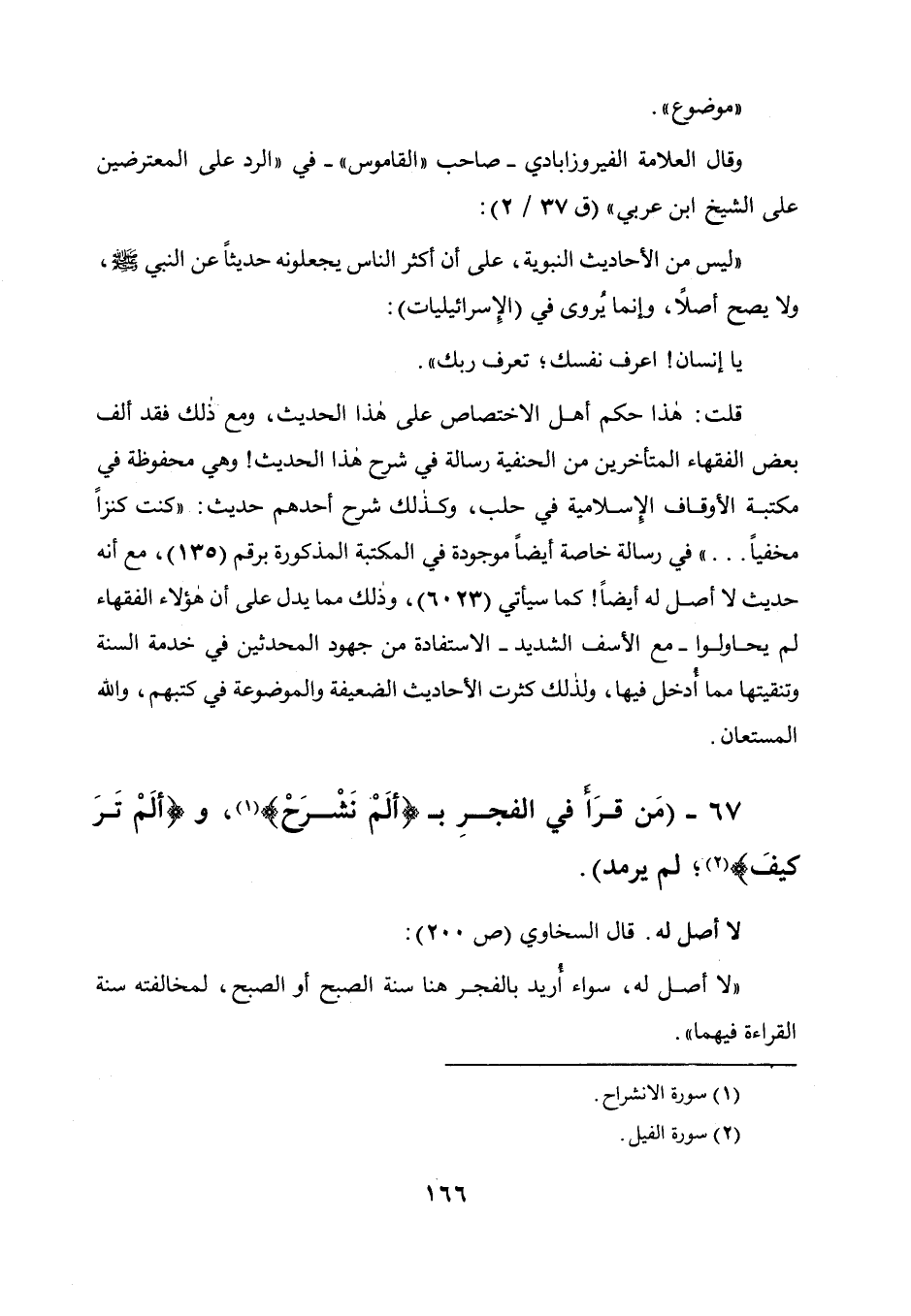 وقال العلامة الفيروز أبادي - صاحب القاموس - في " الرد على المعترضين على الشيخ ابن عربي " (ق 37 / 2) : ليس من الأحاديث النبوية، على أن أكثر الناس يجعلونه حديثا عن النبي صلى الله عليه وسلم، ولا يصح أصلا، وإنما يروي في الإسرائيليات: " يا إنسان اعرف نفسك تعرف ربك ".