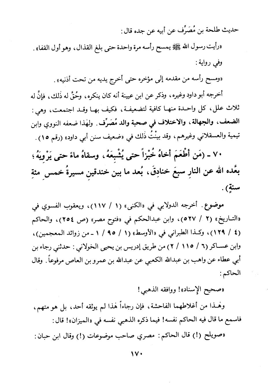 أخرجه أبو داود وغيره، وذكر عن ابن عيينة أنه كان ينكره، وحق له ذلك فإن له ثلاث علل، كل واحدة منها كافية لتضعيفه، فكيف بها وقد اجتمعت، وهي الضعف، والجهالة، والاختلاف في صحبة والد مصرف، ولهذا ضعفه النووي وابن تيمية والعسقلاني وغيرهم، وقد بينت ذلك في " ضعيف سنن أبي داود " (رقم 15) .