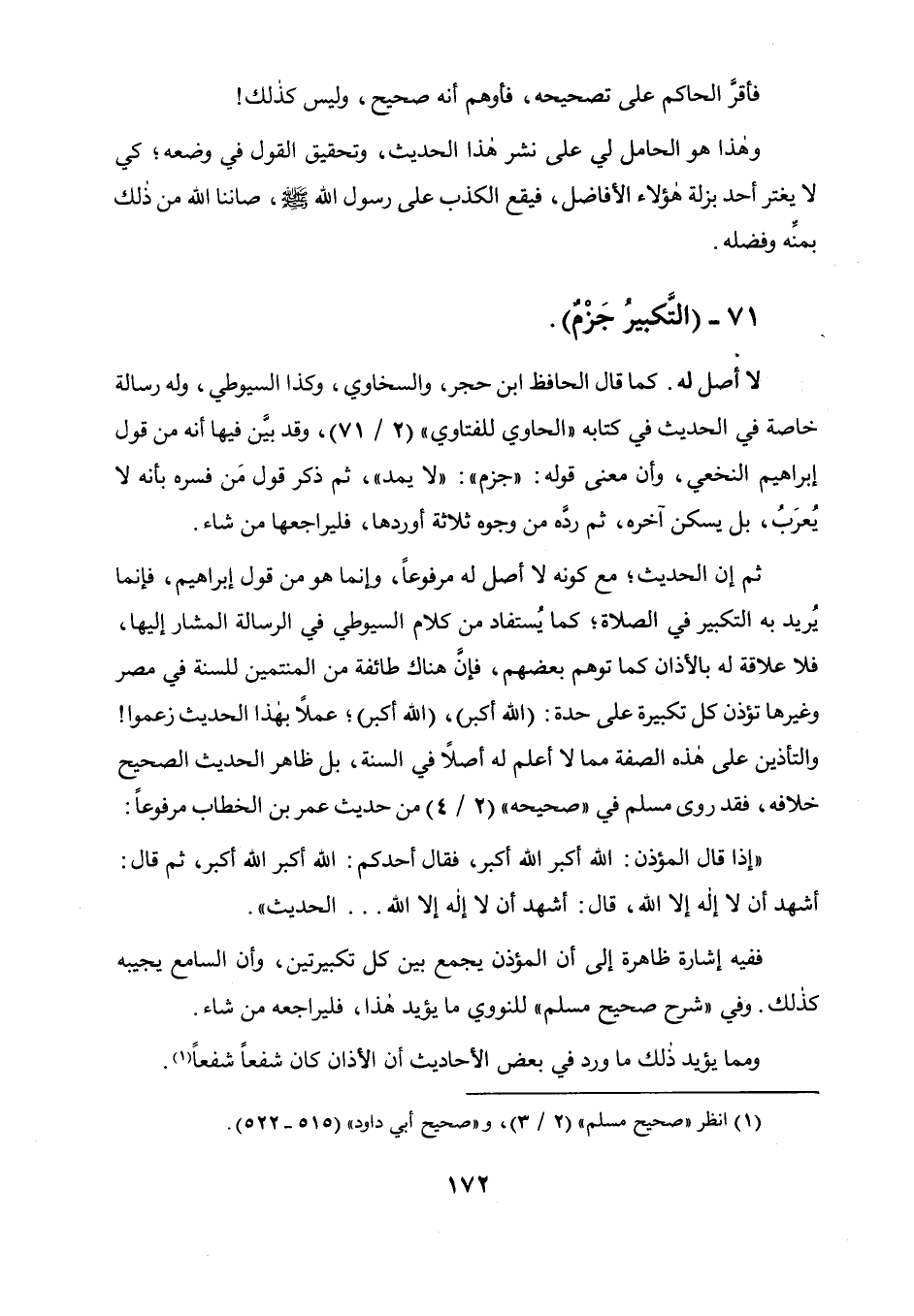 ثم إن الحديث مع كونه لا أصل له مرفوعا، وإنما هو من قول إبراهيم، فإنما يريد به التكبير في الصلاة كما يستفاد من كلام السيوطي في الرسالة المشار إليها فلا علاقة له بالأذان كما توهم بعضهم، فإن هناك طائفة من المنتمين للسنة في مصر وغيرها تؤذن كل تكبيرة على حدة: الله أكبر، الله أكبر، عملا بهذا الحديث زعموا! والتأذين على هذه الصفة مما لا أعلم له أصلا في السنة، بل ظاهر الحديث الصحيح خلافه، فقد روى مسلم في " صحيحه " (2 / 4) من حديث عمر ابن الخطاب مرفوعا: " إذا قال المؤذن: الله أكبر الله أكبر، فقال أحدكم: