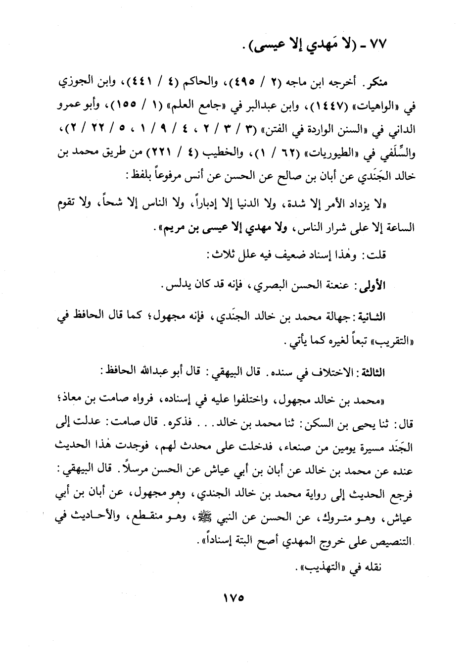 قال البيهقي: قال أبو عبد الله الحافظ: محمد بن خالد مجهول واختلفوا عليه في إسناده، فرواه صامت بن معاذ قال: حدثنا يحيى بن السكن، حدثنا محمد بن خالد ... فذكره، قال صامت: عدلت إلى الجند مسيرة يومين من صنعاء، فدخلت على محدث لهم، فوجدت هذا الحديث عنده عن محمد بن خالد عن أبان بن أبي عياش عن الحسن مرسلا، قال البيهقي: فرجع الحديث إلى رواية محمد بن خالد الجندي وهو مجهول عن أبان أبي عياش، وهو متروك عن الحسن عن النبي صلى الله عليه وسلم، وهو منقطع، والأحاديث في التنصيص على خروج المهدي أصح البتة إسنادا، نقله في " التهذيب ".