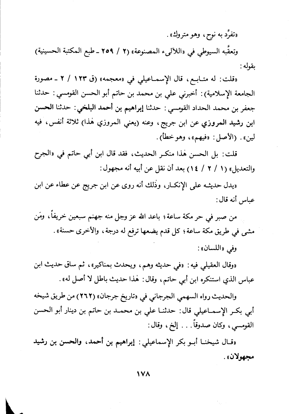 تفرد به نوح وهو متروك، وتعقبه السيوطي في " اللآليء المصنوعة " (2 / 259 طبع المكتبة الحسينية) بقوله: قلت: له متابع، قال الإسماعيلي في " معجمه " (ق 123 / 2 - مصورة الجامعة الإسلامية) : أخبرني علي بن محمد بن حاتم أبو الحسن القومسي: حدثنا جعفر بن محمد الحداد القومسي، حدثنا إبراهيم بن أحمد البلخي، حدثنا الحسن بن رشيد المروزي عن ابن جريج، وعنه يعني المروزي هذا ثلاثة أنفس، فيه لين، الأصل: فيهم وهو خطأ.