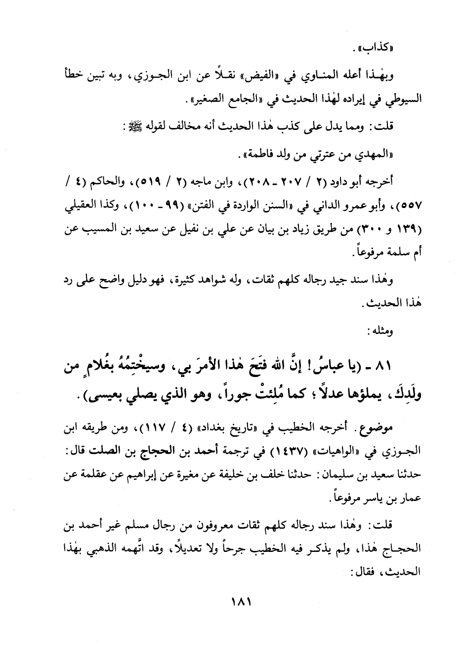 " المهدي من عترتي من ولد فاطمة "، أخرجه أبو داود (2 / 207 - 208) وابن ماجه (2 / 519) والحاكم (4 / 557) وأبو عمرو الداني في " السنن الواردة في الفتن " (99 - 100) وكذا العقيلي (139 و300) من طريق زياد بن بيان عن علي بن نفيل عن سعيد بن المسيب عن أم سلمة مرفوعا، وهذا سند جيد رجاله كلهم