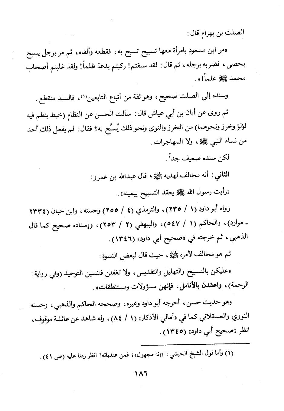 ثم روى عن أبان بن أبي عياش قال: سألت الحسن عن النظام (خيط ينظم فيه لؤلؤ وخرز ونحوهما) من الخرز والنوى ونحوذلك يسبح به؟ فقال: لم يفعل ذلك أحد من نساء النبي صلى الله عليه وسلم ولا المهاجرات، ولكن سنده ضعيف جدا.