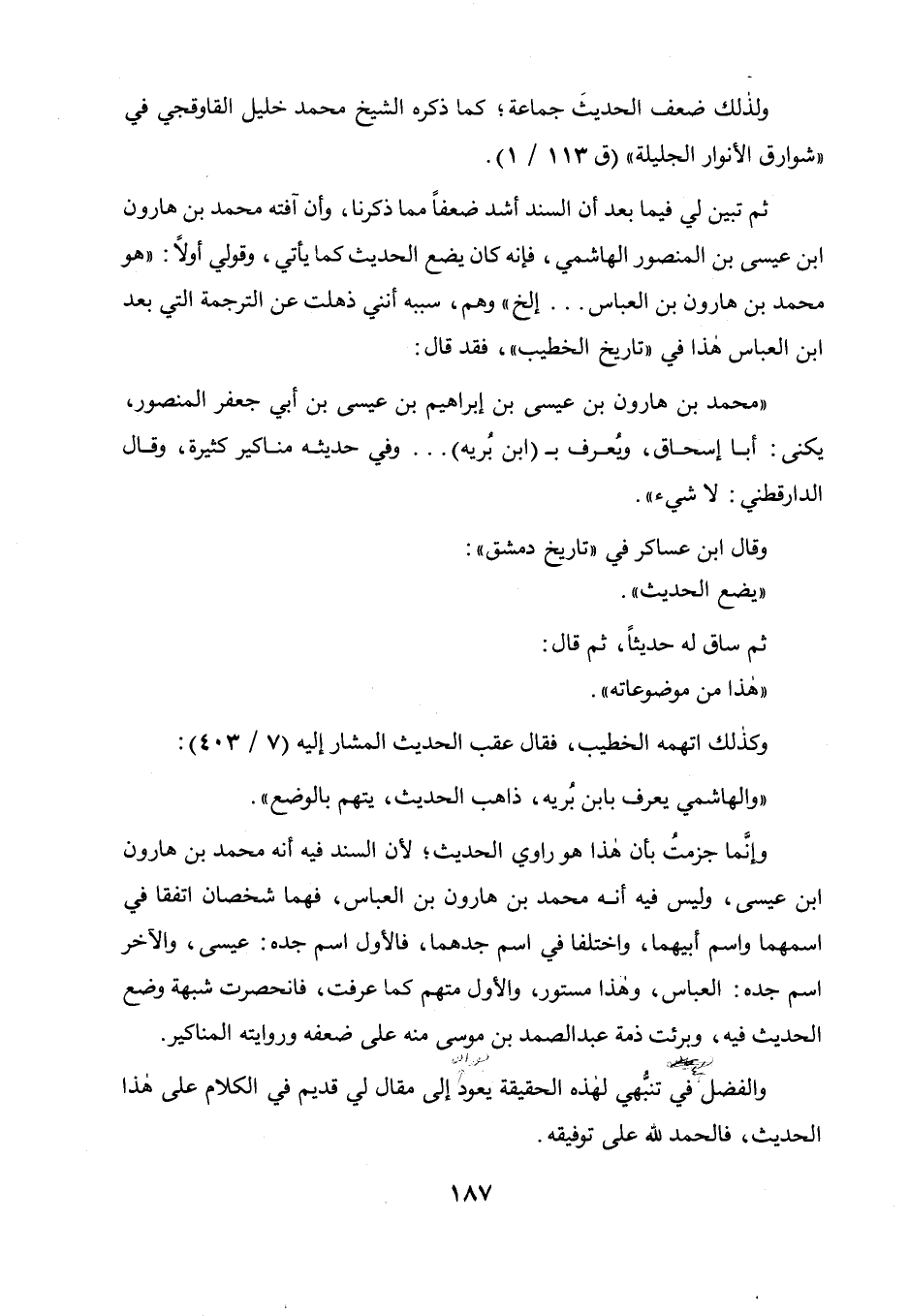 ثم تبين لي فيما بعد أن السند أشد ضعفا مما ذكرنا، وأن آفته محمد بن هارون بن عيسى بن منصور الهاشمي، فإنه كان يضع الحديث كما يأتي، وقولي أولا هو محمد ابن هارون بن العباس.. إلخ وهم، سببه أنني ذهلت عن الترجمة التي بعد ابن العباس هذا في " تاريخ الخطيب " فقد قال: محمد بن هارون بن عيسى بن إبراهيم بن عيسى بن أبي جعفر المنصور، يكنى: أبا إسحاق، ويعرف بـ " ابن برية " ... وفي حديثه مناكير كثيرة، وقال الدارقطني: لا شيء، وقال ابن عساكر في " تاريخ دمشق ": يضع الحديث، ثم ساق له حديثا، ثم قال: هذا من موضوعاته، وكذلك اتهمه الخطيب، فقال عقب الحديث المشار إليه (7 / 403) : والهاشمي يعرف بابن برية، ذاهب الحديث، يتهم بالوضع، وإنما جزمت بأن هذا هو راوي الحديث، لأن السند فيه أنه محمد بن هارون بن عيسى، وليس فيه أنه محمد بن هارون بن العباس، فهما شخصان: اتفقا في اسمهما واسم أبيهما، واختلفا في اسم جدهما، فالأول اسم جده عيسى، والآخر اسم جده العباس وهذا مستور، والأول متهم كما عرفت، فانحصرت شبهة وضع الحديث فيه، وبرئت ذمة عبد الصمد ابن موسى منه على ضعفه وروايته المناكير، والفضل في تنبهي لهذه الحقيقة يعود إلى مقال لي قديم في الكلام على هذا الحديث، فالحمد لله على توفيقه.