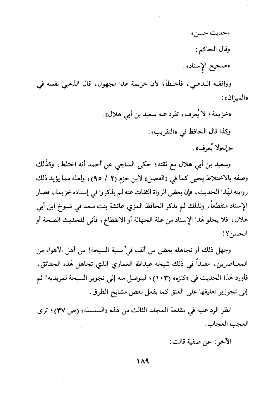 لابن حزم (2 / 95) ، ولعله مما يؤيد ذلك روايته لهذا الحديث، فإن بعض الرواة الثقات عنه لم يذكروا في إسناده خزيمة فصار الإسناد منقطعا ولذلك لم يذكر الحافظ المزي عائشة بنت سعد في شيوخ ابن أبي هلال فلا يخلوهذا الإسناد من علة الجهالة أو الانقطاع فأنى للحديث الصحة أو الحسن؟ ! .