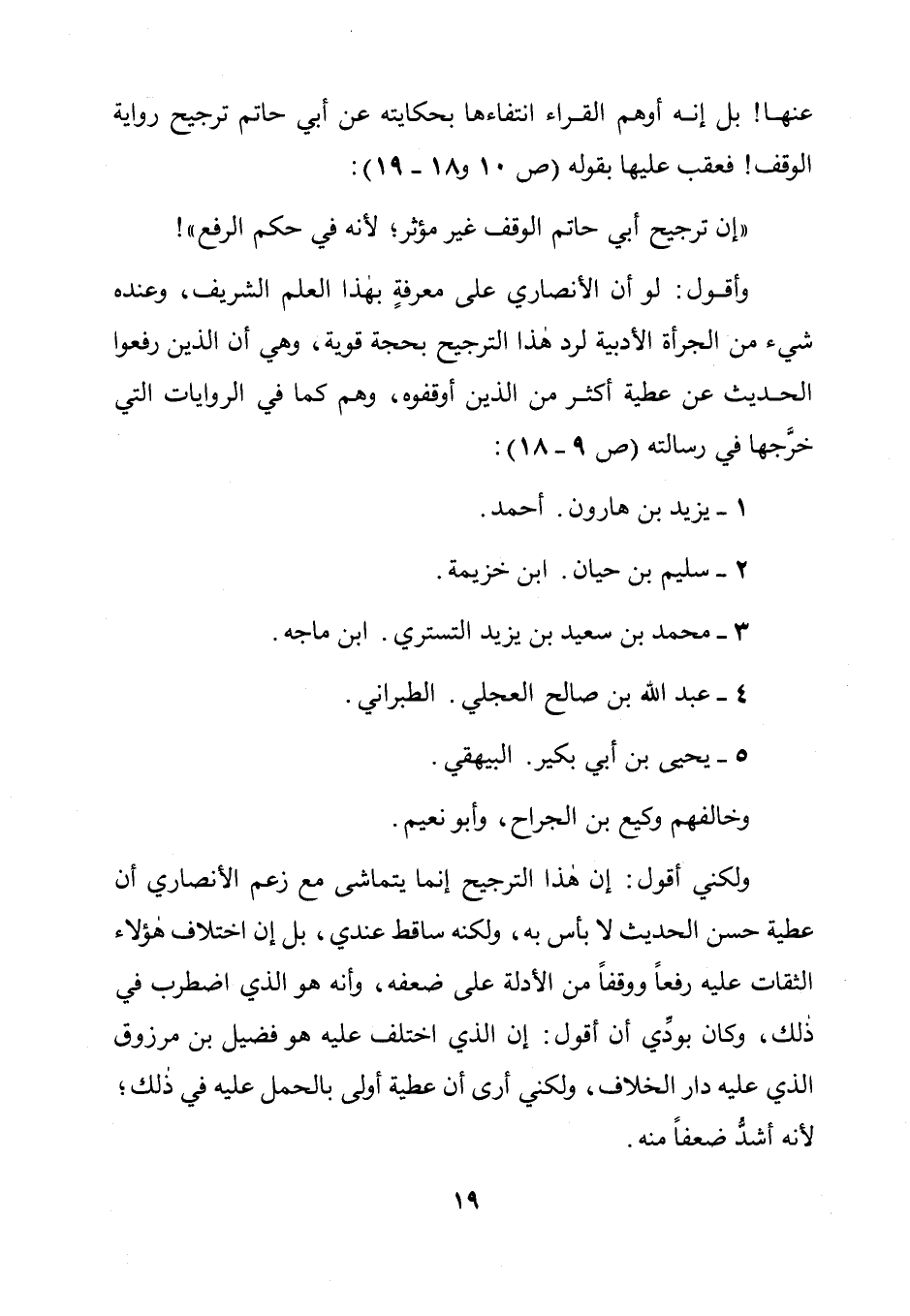وأقول: لو أن الأنصاري على معرفةٍ بهذا العلم الشريف، وعنده شيء من الجرأة الأدبية لرد لهذا الترجيح بحجة قوية، وهي أن الذين رفعوا الحديث عن عطية أكثر من الذين أوقفوه، وهم كما في الروايات التي خرَّجها في رسالته (ص 9-18) :