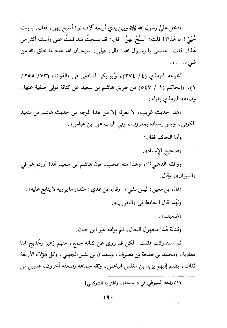قال: " قولي: سبحان الله عدد ما خلق الله من شيء.. "، أخرجه الترمذي (4 /274) وأبو بكر الشافعي في " الفوائد " (73 / 255 / 1) ، والحاكم (1 /547) من طريق هاشم بن سعيد عن كنانة مولى صفية عنها، وضعفه الترمذي بقوله: