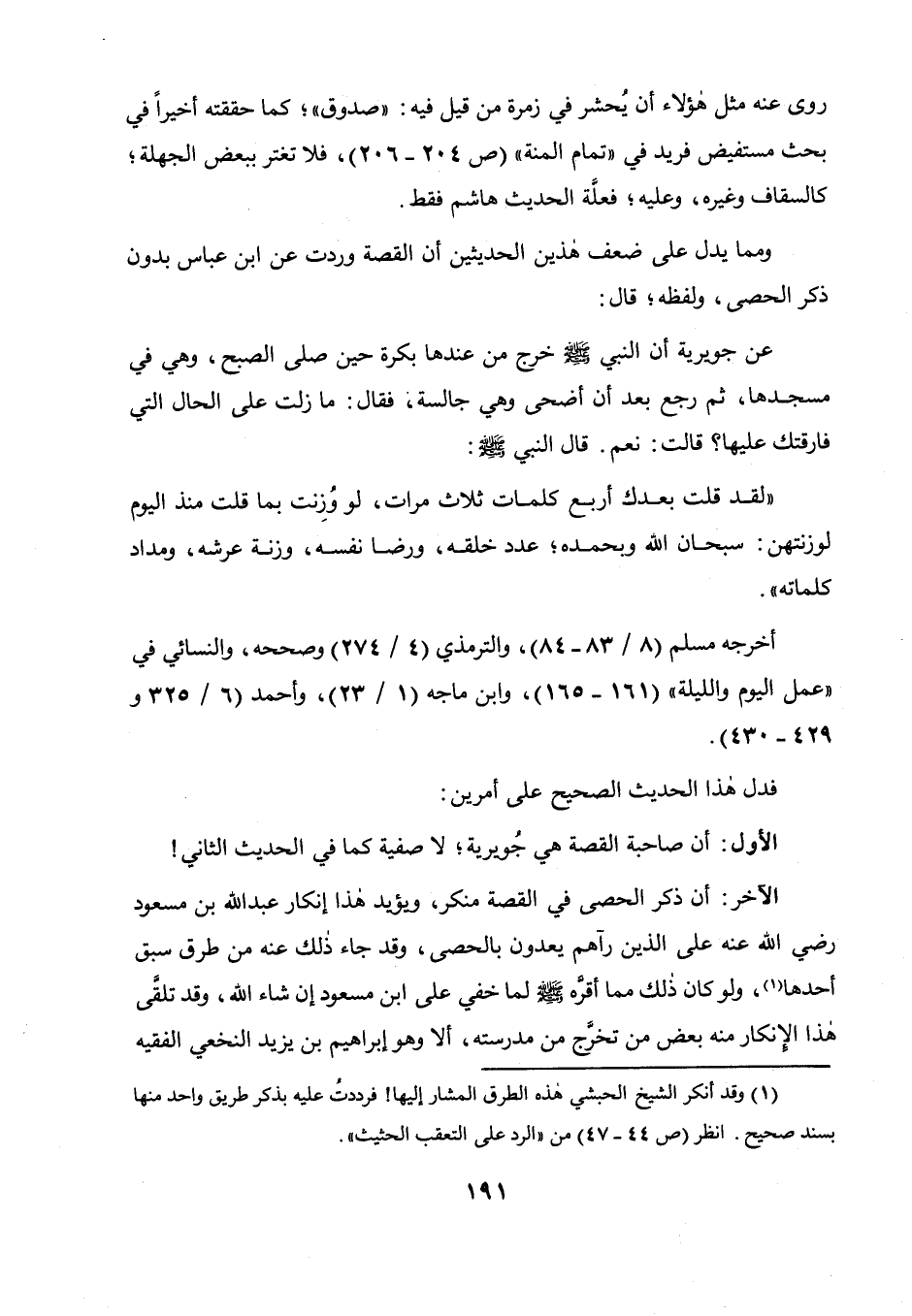 ومما يدل على ضعف هذين الحديثين أن القصة وردت عن ابن عباس بدون ذكر الحصى ولفظه قال: عن جويرية أن النبي صلى الله عليه وسلم خرج من عندها بكرة حين صلى الصبح وهي في مسجدها، ثم رجع بعد أن أضحى وهي جالسة، فقال: ما زلت على الحال التي فارقتك عليها؟ قالت: نعم، قال النبي صلى الله عليه وسلم: " لقد قلت بعدك أربع كلمات ثلاث مرات لووزنت بما قلت منذ اليوم لوزنتهن: سبحان الله وبحمده عدد خلقه، ورضا نفسه، وزنة عرشه ومداد كلماته "، أخرجه مسلم (8 / 83 - 84) والترمذي (4 / 274) وصححه والنسائي في " عمل اليوم والليلة " (161 - 165) وابن ماجه (1 / 23) وأحمد (6 / 325 و429 - 430) ، فدل هذا الحديث الصحيح على أمرين: