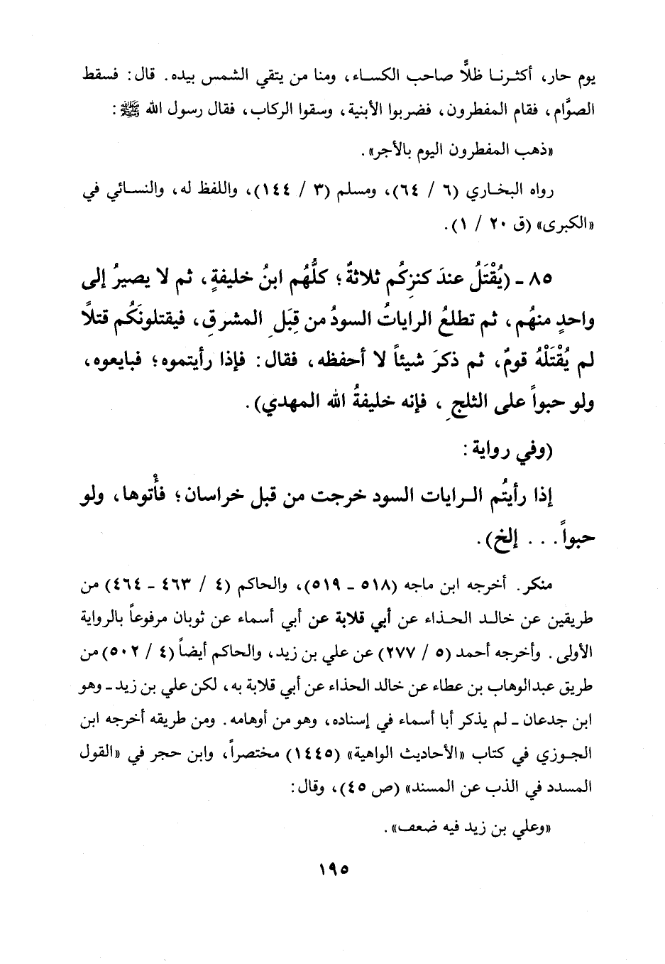 85 - " يقتل عند كنزكم ثلاثة كلهم ابن خليفة، ثم لا يصير إلى واحد منهم، ثم تطلع الرايات السود من قبل المشرق فيقتلونكم قتلا لم يقتله قوم، ثم ذكر شيئا لا أحفظه فقال: فإذا رأيتموه فبايعوه ولوحبوا على الثلج، فإنه خليفة الله المهدي - وفي رواية - إذا رأيتم الرايات السود خرجت من قبل خراسان فأتوها ولو حبوا.. إلخ ".