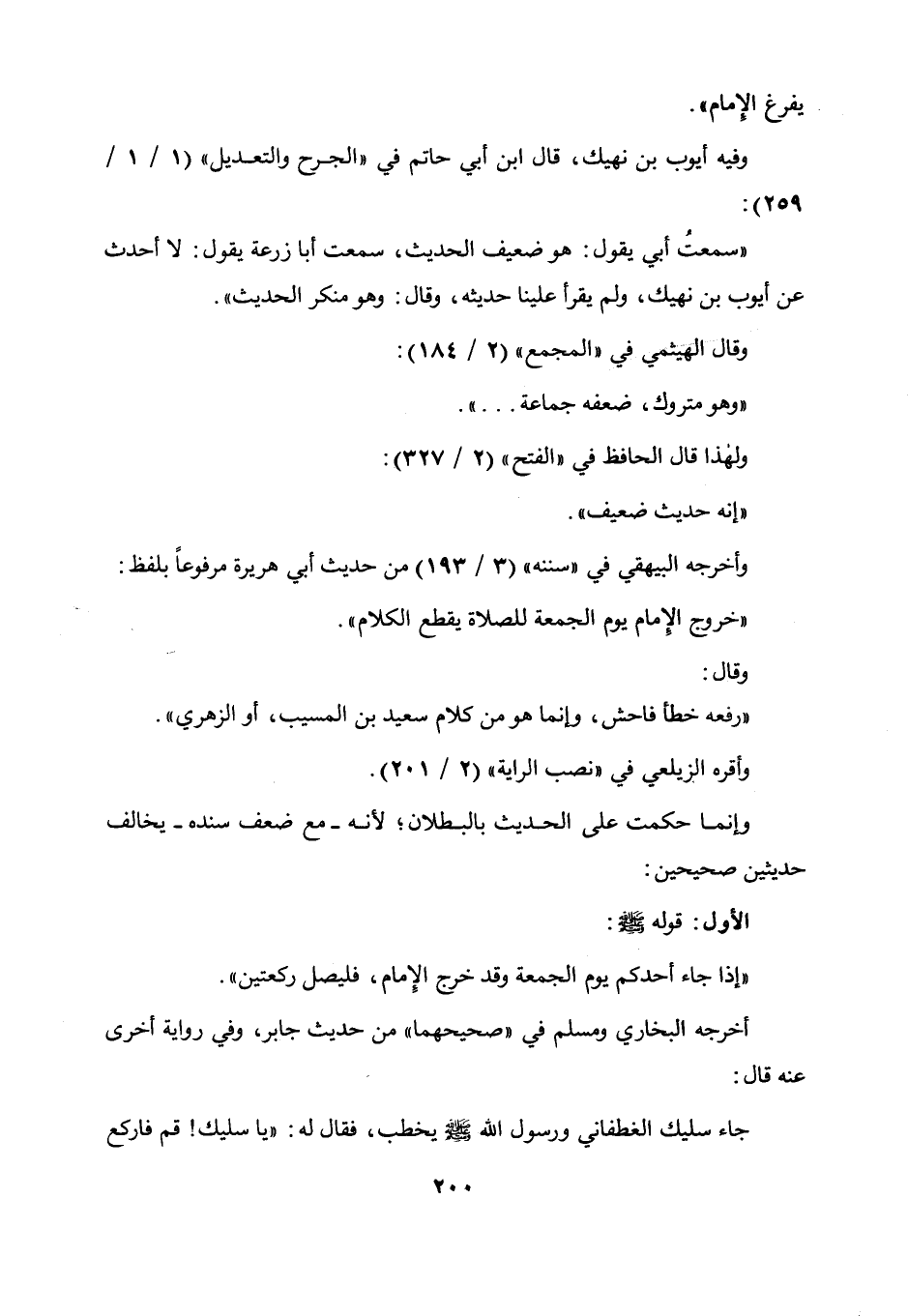 يفرغ الإمام " وفيه أيوب بن نهيك، قال ابن أبي حاتم في " الجرح والتعديل " (1 / 1 / 259) : سمعت أبي يقول: هو ضعيف الحديث، سمعت أبا زرعة يقول: لا أحدث عن أيوب ابن نهيك، ولم يقرأ علينا حديثه وقال: وهو منكر الحديث، وقال الهيثمي في " المجمع " (2 / 184) : وهو متروك ضعفه جماعة ... ولهذا قال الحافظ في " الفتح " (2 / 327) : إنه حديث ضعيف، وأخرجه البيهقي في سننه (3 / 193) من حديث أبي هريرة مرفوعا بلفظ: " خروج الإمام يوم الجمعة للصلاة يقطع الكلام "، وقال: