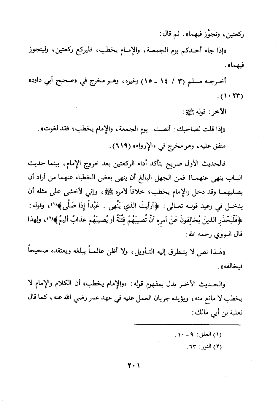 فالحديث الأول صريح بتأكد أداء الركعتين بعد خروج الإمام، بينما حديث الباب ينهي عنهما! فمن الجهل البالغ أن ينهي بعض الخطباء عنهما من أراد أن يصليهما وقد دخل والإمام يخطب خلافا لأمره صلى الله عليه وسلم، وإني لأخشى على مثله أن يدخل في وعيد قوله تعالى: {أرأيت الذي ينهى عبدا إذا صلى} وقوله: {فليحذر الذين يخالفون عن أمره أن تصيبهم فتنة أو يصيبهم عذاب أليم} ولهذا قال النووي رحمه الله: هذا نص لا يتطرق إليه التأويل، ولا أظن عالما يبلغه ويعتقده صحيحا فيخالفه.