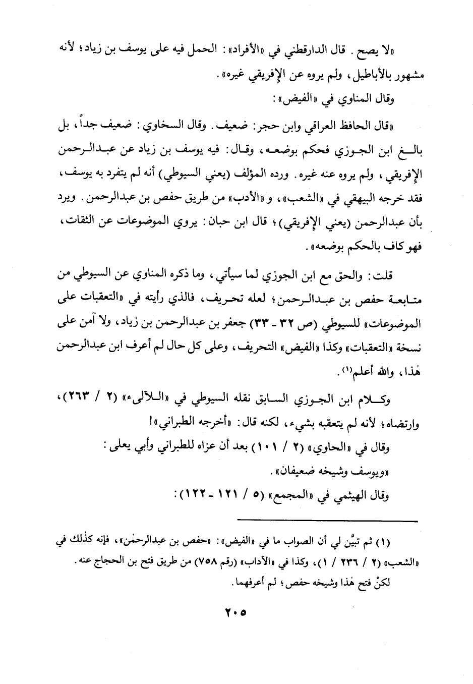 فيه يوسف بن زياد عن عبد الرحمن الإفريقي، ولم يروه عنه غيره ورده المؤلف يعني السيوطي أنه لم يتفرد به يوسف، فقد خرجه البيهقي في " الشعب " و" الأدب " من طريق حفص بن عبد الرحمن، ويرد بأن عبد الرحمن يعني الإفريقي قال ابن حبان: يروي الموضوعات عن الثقات، فهو كاف بالحكم بوضعه.