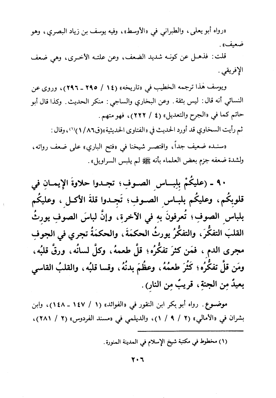90 - " عليكم بلباس الصوف تجدوا حلاوة الإيمان في قلوبكم، وعليكم بلباس الصوف تجدوا قلة الأكل، وعليكم بلباس الصوف تعرفون به في الآخرة، وإن لباس الصوف يورث القلب التفكر، والتفكر يورث الحكمة، والحكمة تجري في الجوف مجرى الدم فمن كثر تفكره قل طعمه، وكل لسانه، ورق قلبه، ومن قل تفكره كثر طعمه، وعظم بدنه، وقسا قلبه، والقلب القاسي بعيد من الجنة، قريب من النار ".