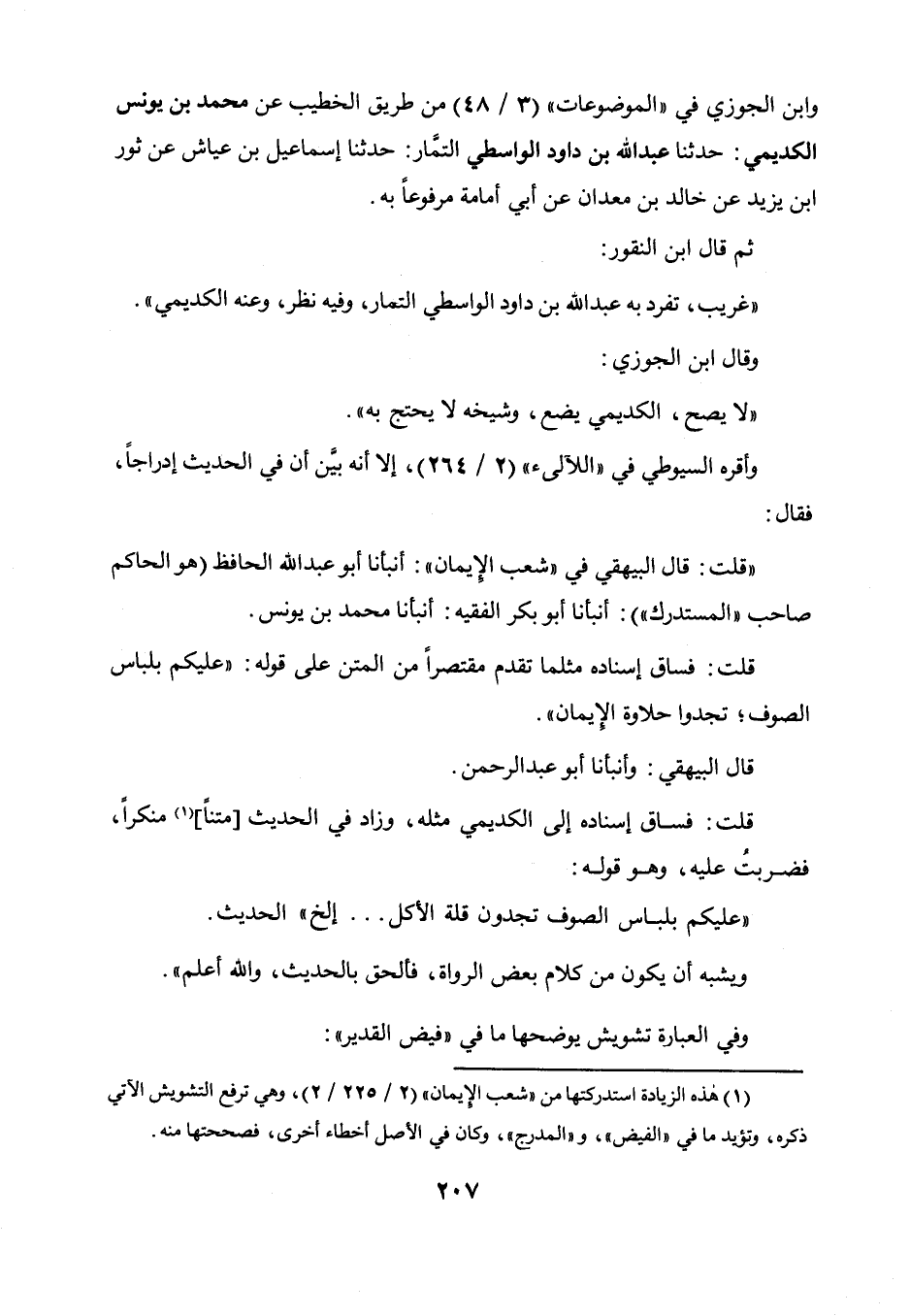 فساق إسناده مثلما تقدم مقتصرا من المتن على قوله: " عليكم بلباس الصوف تجدوا حلاوة الإيمان " - قال البيهقي: وأنبأنا أبو عبد الرحمن - قلت: فساق إسناده إلى الكديمي مثله، وزاد في الحديث متنا منكرا، فضربت عليه وهو قوله:
