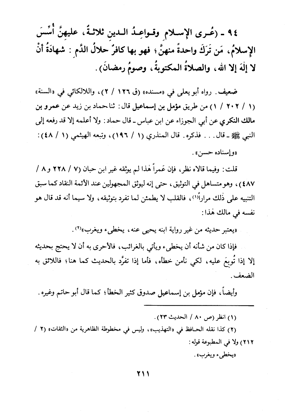 94 - " عرى الإسلام وقواعد الدين ثلاثة، عليهن أسس الإسلام، من ترك واحدة منهن فهو بها كافر حلال الدم: شهادة أن لا إله إلا الله، والصلاة المكتوبة، وصوم رمضان ".