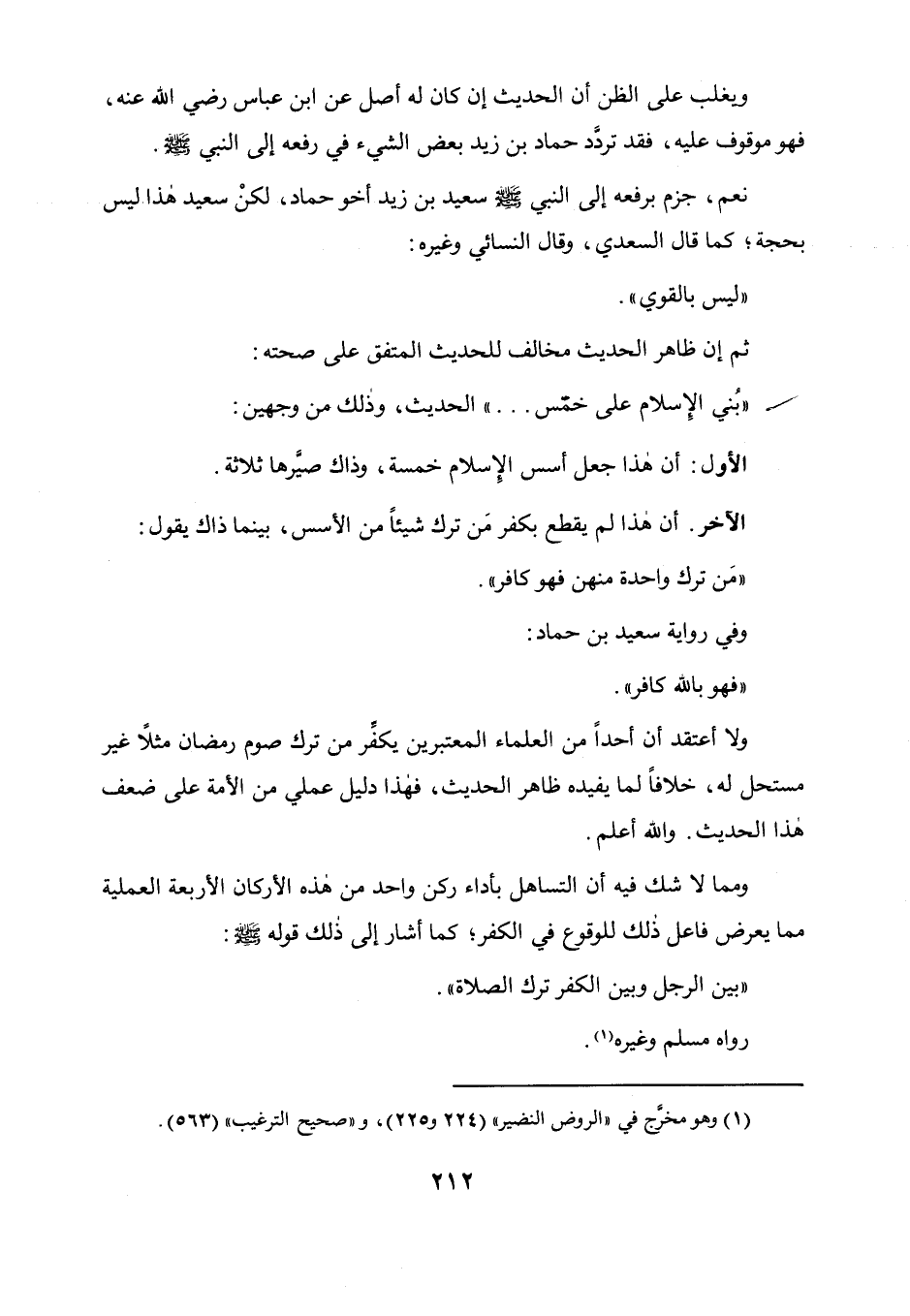 الآخر: أن هذا لم يقطع بكفر من ترك شيئا من الأسس، بينما ذاك يقول: من ترك واحدة منهن فهو كافر، وفي رواية سعيد بن حماد: فهو بالله كافر ولا أعتقد أن أحدا من العلماء المعتبرين يكفر من ترك صوم رمضان مثلا غير مستحل له خلافا لما يفيده ظاهر الحديث، فهذا دليل عملي من الأمة على ضعف هذا الحديث والله أعلم.