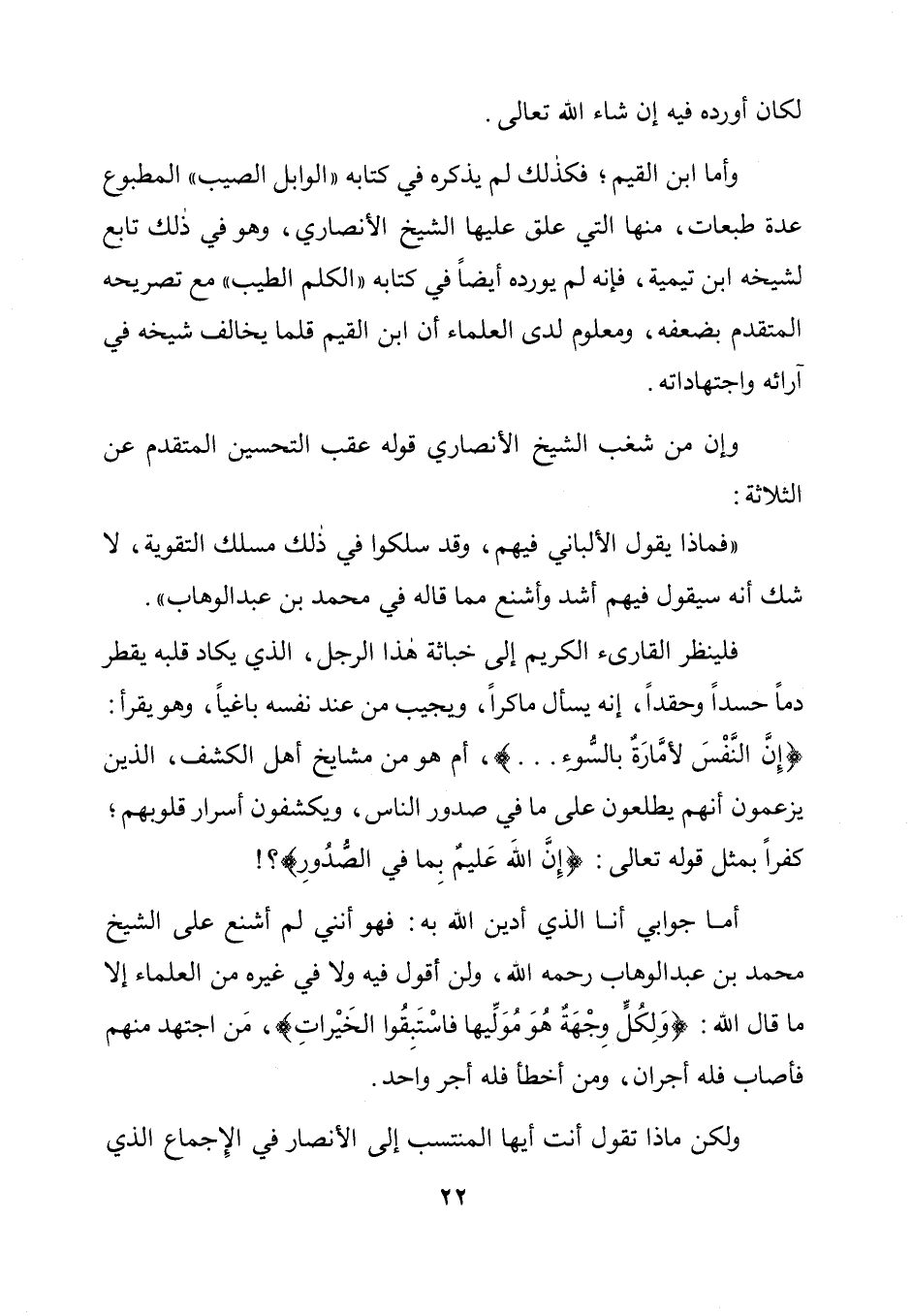 أما جوابي أنا الذي أدين الله به: فهو أنني لم أشنع على الشيخ محمد بن عبد الوهاب رحمه الله، ولن أقول فيه ولا في غيره من العلماء إلا ما قال الله: "وَلِكُلٍّ وِجْهَةٌ هُوَ مُوَلِّيها فاسْتَبِقُوا الخَيْراتِ "، مَن اجتهد منهم فأصاب فله أجران، ومن أخطأ فله أجر واحد.