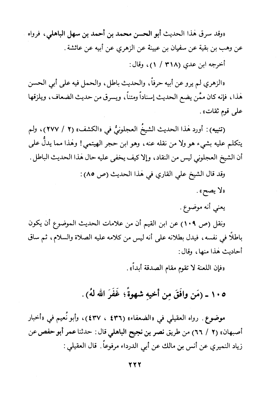 ونقل (ص 109) عن ابن القيم أن من علامات الحديث الموضوع أن يكون باطلا في نفسه فيدل بطلانه على أنه ليس من كلامه عليه الصلاة والسلام، ثم ساق أحاديث هذا منها، وقال: فإن اللعنة لا تقوم مقام الصدقة أبدا.