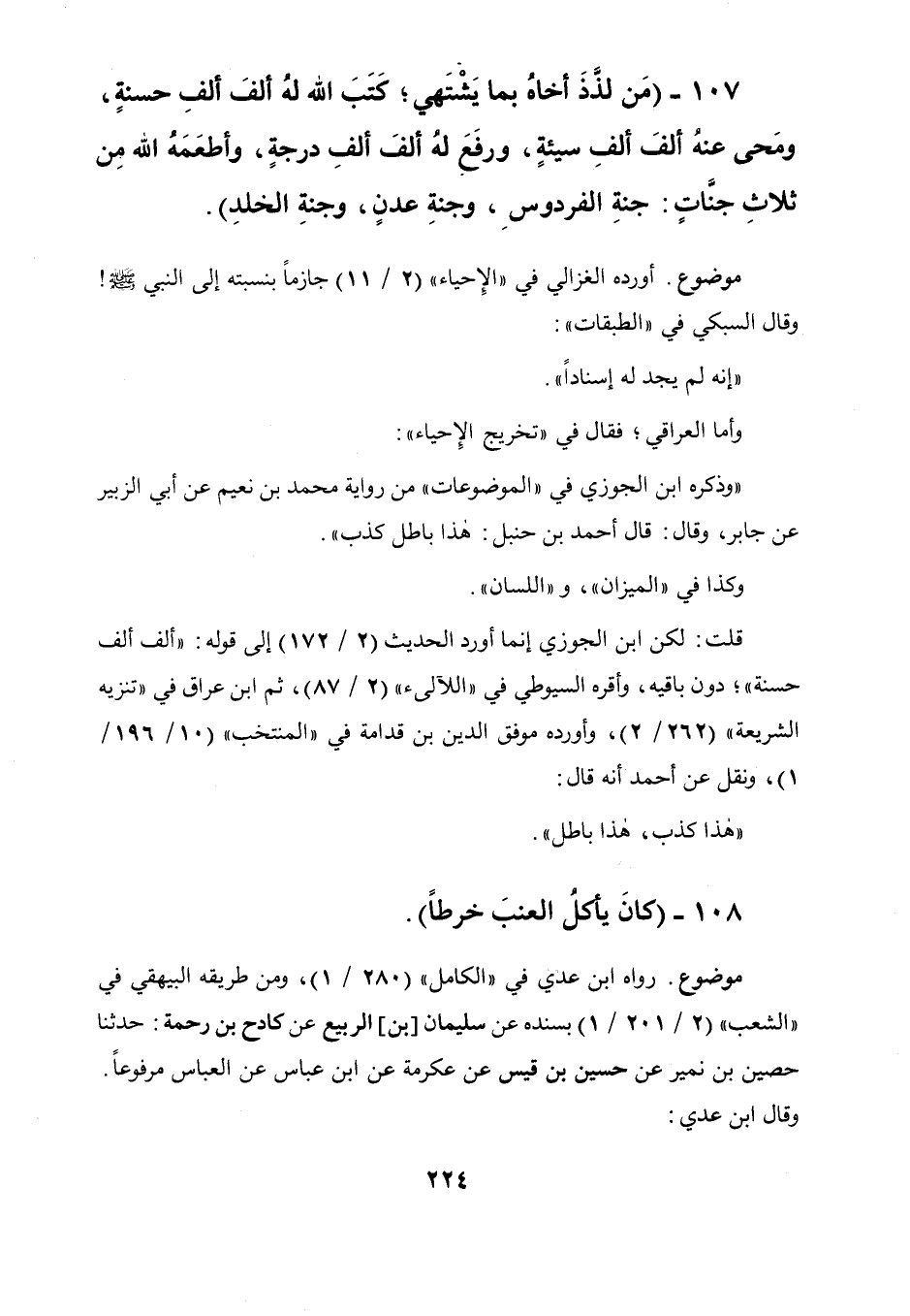 107 - " من لذذ أخاه بما يشتهي كتب الله له ألف ألف حسنة، ومحى عنه ألف ألف سيئة، ورفع له ألف ألف درجة وأطعمه الله من ثلاث جنات: جنة الفردوس، وجنة عدن، وجنة الخلد ".