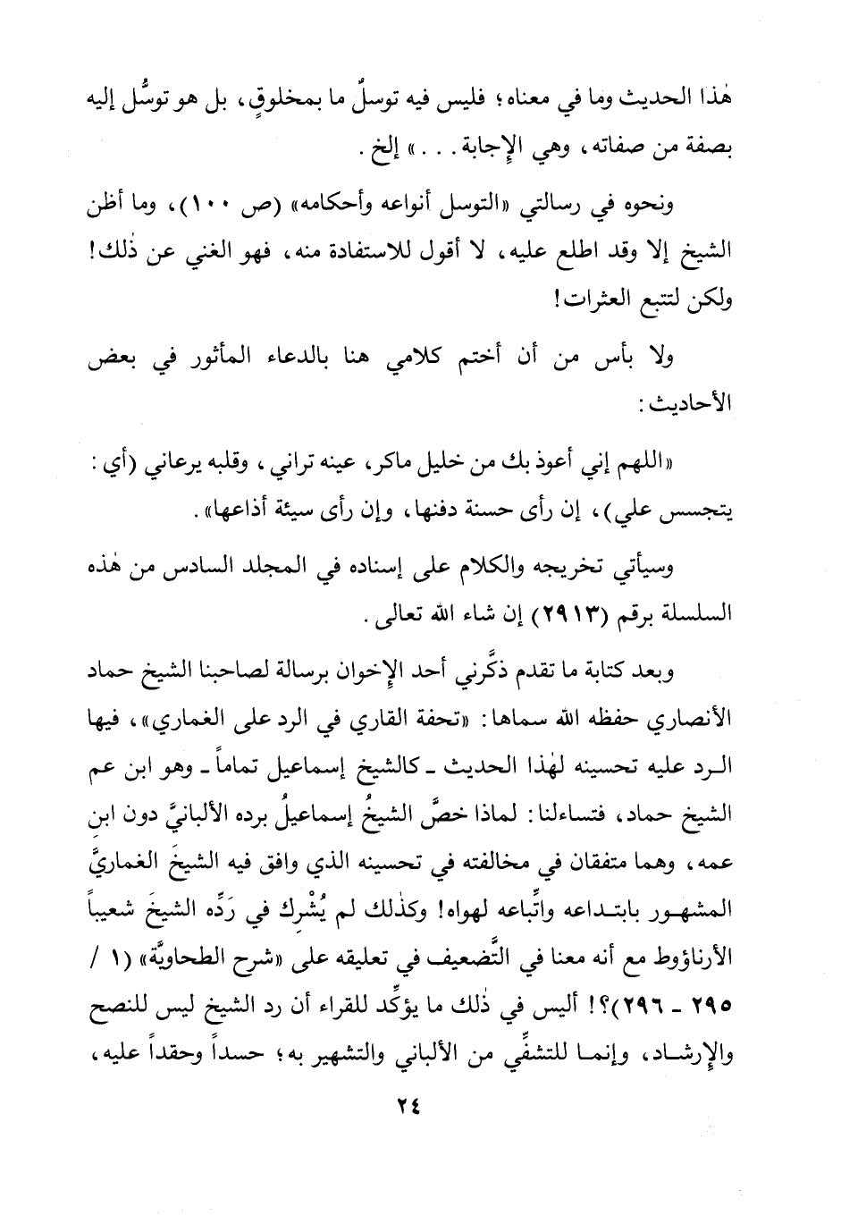 وبعد كتابة ما تقدم ذكَّرني أحد الِإخوان برسالة لصاحبنا الشيخ حماد الأنصاري حفظه الله سماها: "تحفة القاري في الرد على الغماري "، فيها الرد عليه تحسينه لهذا الحديث- كالشيخ إسماعيل تماماً- وهو ابن عم الشيخ حماد، فتساءلنا: لماذا خصَّ الشيخُ إسماعيلُ برده الألبانيَّ دون ابنِ عمه، وهما متفقان في مخالفته في تحسينه الذي وافق فيه الشيخَ الغماريَّ المشهور بابتداعه وإتباعه لهواه! وكذلك لم يُشْرِك في رَدَه الشيخَ شعيباً الأرناؤوط مع أنه معنا في التضعيف، في تعليقه على "شرح الطحاويَّة" (1/ 295- 296) ؟! أليس في ذلك ما يؤكِّد للقراء أن رد الشيخ ليس للنصح والِإرشاد، وإنما للتشفِّي من الألباني والتشهير به. حسداً وحقداً عليه،