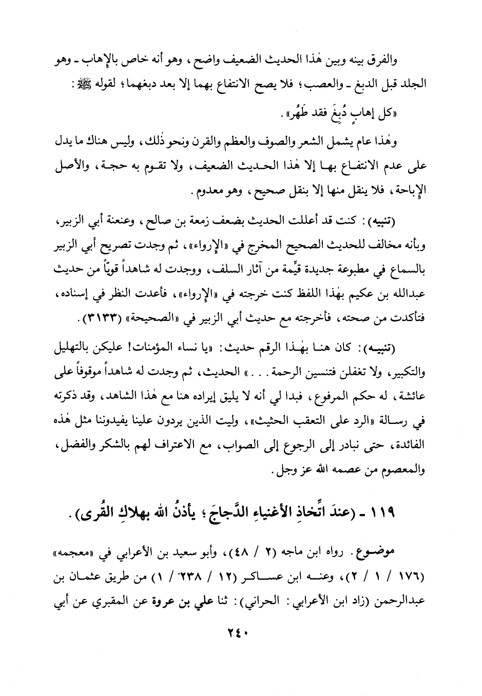 والفرق بينه وبين هذا الحديث الضعيف واضح، وهو أنه خاص بالإهاب (وهو الجلد قبل الدبغ) والعصب فلا يصح الانتفاع بهما إلا بعد دبغهما لقوله صلى الله عليه وسلم: " كل إهاب دبغ فقد طهر "، وهذا عام يشمل الشعر والصوف والعظم والقرن ونحوذلك، وليس هناك ما يدل على عدم الانتفاع بها إلا هذا الحديث الضعيف، ولا تقوم به حجة والأصل الإباحة، فلا ينقل منها إلا بنقل صحيح وهو معدوم.