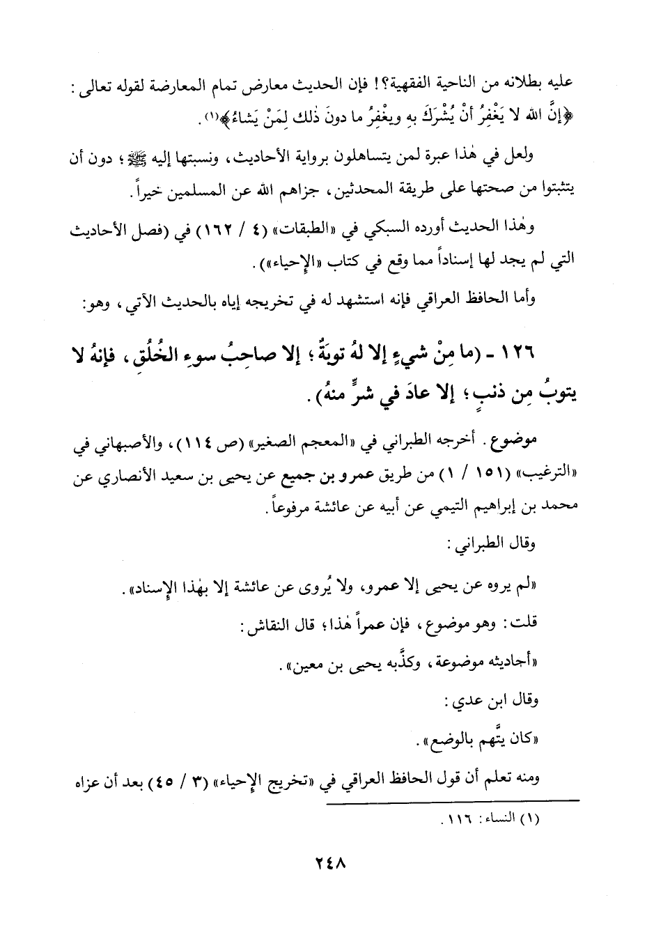 عليه بطلانه من الناحية الفقهية؟! فإن الحديث معارض تمام المعارضة لقوله تعالى: {إن الله لا يغفر أن يشرك به، ويغفر ما دون ذلك لمن يشاء} ، ولعل في هذا عبرة لمن يتساهلون برواية الأحاديث ونسبتها إليه صلى الله عليه وسلم دون أن يتثبتوا من صحتها على طريقة المحدثين جزاهم الله عن المسلمين خيرا.