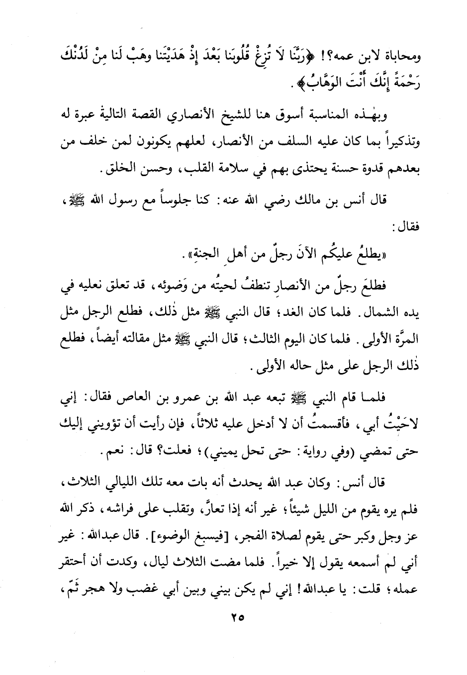 فطلعَ رجلٌ من الأنصارِ تنطفُ لحيتُه من وَضوئه، قد تعلق نعليه في يده الشمال. فلما كان الغد؛ قال النبي - صلى الله عليه وسلم - مثل ذلك، فطلع الرجل مثل المرَّة الأولى. فلما كان اليوم الثالث؛ قال النبي - صلى الله عليه وسلم - مثل مقالته أيضاً، فطلع ذلك الرجل على مثل حاله الأولى.