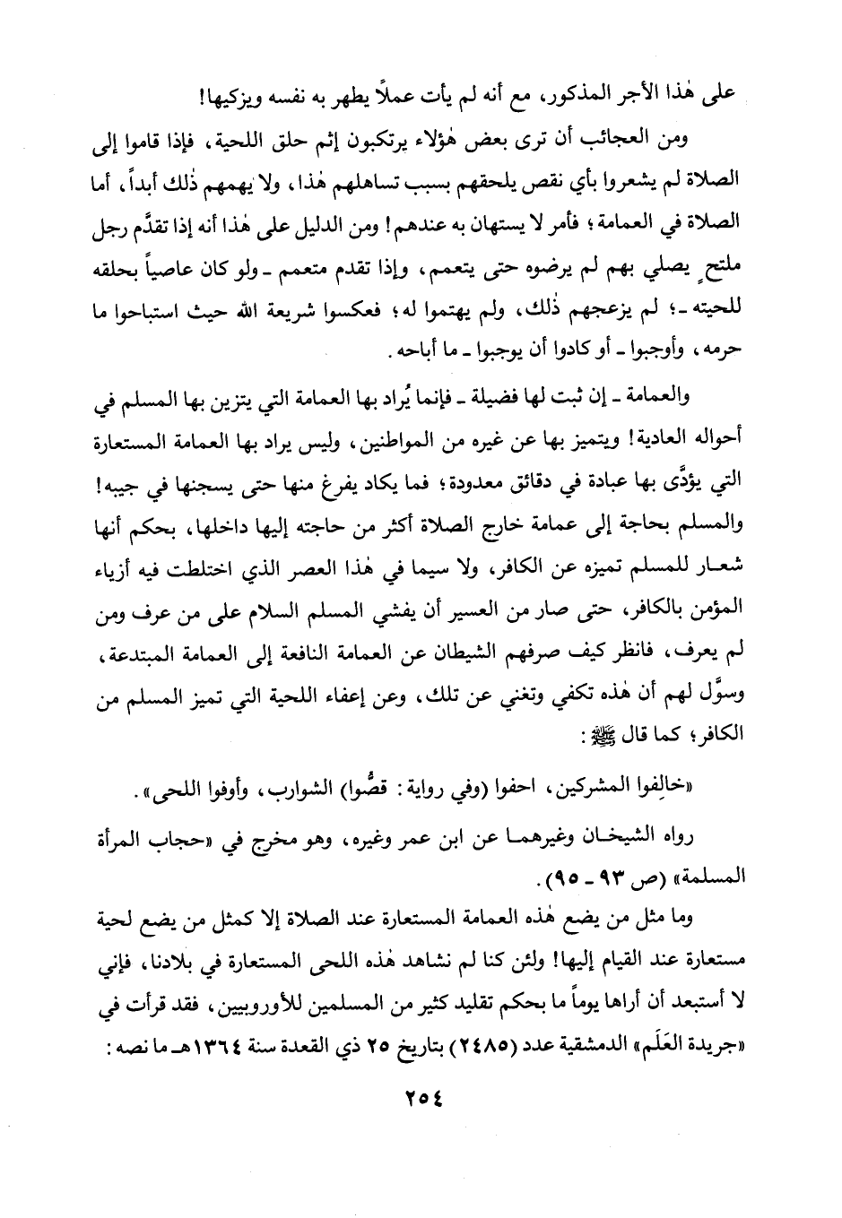 وما مثل من يضع هذه العمامة المستعارة عند الصلاة إلا كمثل من يضع لحية مستعارة عند القيام إليها! ولئن كنا لم نشاهد هذه اللحى المستعارة في بلادنا فإني لا أستبعد أن أراها يوما ما بحكم تقليد كثير من المسلمين للأوربيين. فقد قرأت في " جريدة العلم الدمشقية " عدد (2485) بتاريخ 25 ذي القعدة سنة 1364 هـ ما نصه: