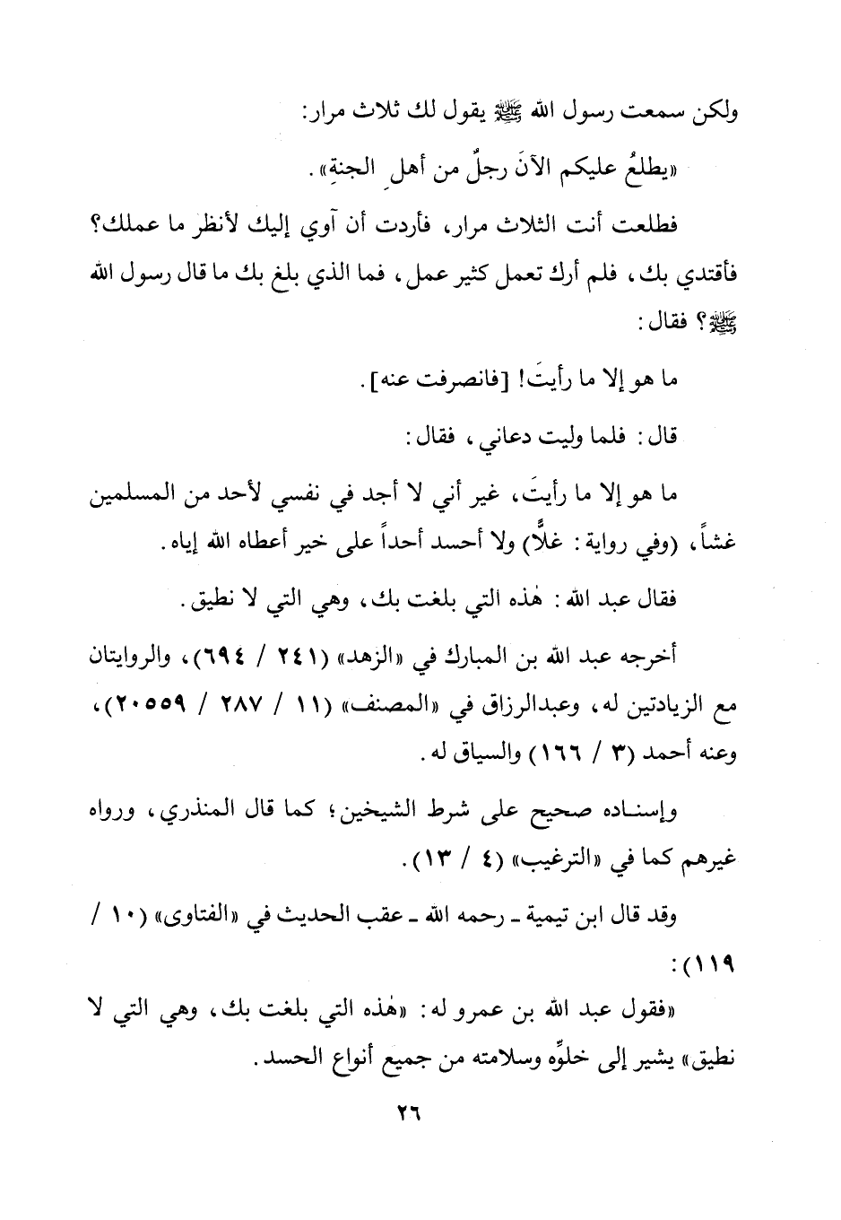 "فقول عبد الله بن عمرو له: "هذه التي بلغت بك، وهي التي لا نطيق " يشير إلى خلوِّه وسلامته من جميع أنواع الحسد.