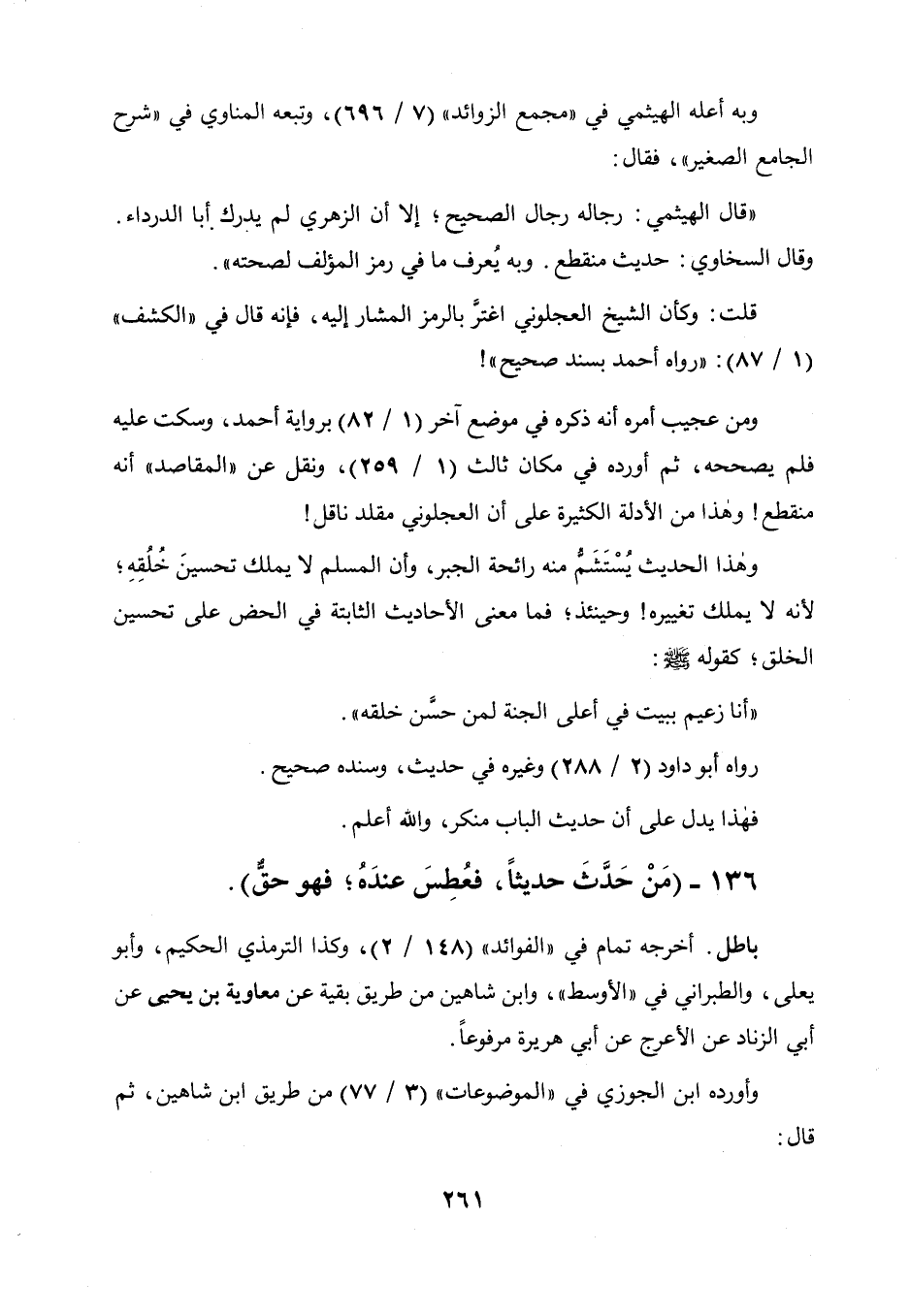 قلت: وكأن الشيخ العجلوني اغتر بالرمز المشار إليه فإنه قال في " الكشف " (1 / 87) ، رواه أحمد بسند صحيح "! ومن عجيب أمره أنه ذكره في موضع آخر (1 / 82) برواية أحمد وسكت عليه فلم يصححه، ثم أورده في مكان ثالث (1 /259) ونقل عن " المقاصد " أنه منقطع! ، وهذا من الأدلة الكثيرة على أن العجلوني مقلد ناقل، وهذا الحديث يستشم منه رائحة الجبر وأن المسلم لا يملك تحسين خلقه لأنه لا يملك تغييره! ، وحينئذ فما معنى الأحاديث الثابتة في الحض على تحسين الخلق كقوله صلى الله عليه وسلم: " أنا زعيم ببيت في أعلى الجنة لمن حسن خلقه " رواه أبو داود (2 / 288) وغيره في حديث.