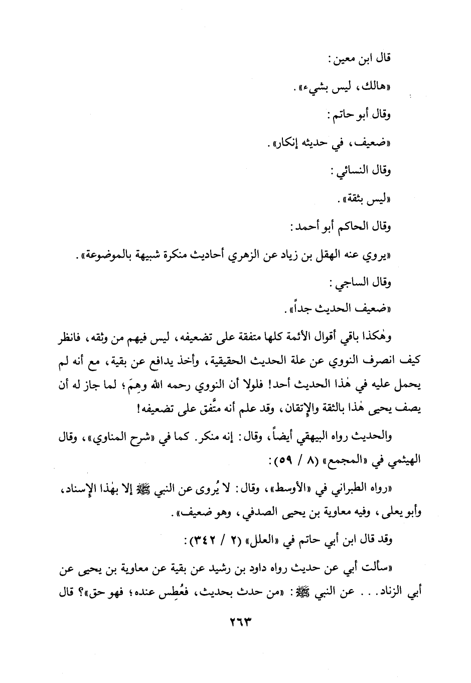 قال ابن معين: هالك ليس بشيء، وقال أبو حاتم: ضعيف في حديثه إنكار، وقال النسائي: ليس بثقة، وقال الحاكم أبو أحمد: يروي عنه الهقل بن زياد عن الزهري أحاديث منكرة شبيهة بالموضوعة، وقال الساجي: ضعيف الحديث جدا، وهكذا باقي أقوال الأئمة كلها متفقة على تضعيفه ليس فيهم من وثقه، فانظر كيف انصرف النووي عن علة الحديث الحقيقية، وأخذ يدافع عن بقية مع أنه لم يحمل عليه في هذا الحديث أحد! فلولا أن النووي رحمه الله وهم لما جاز له أن يصف يحيى هذا بالثقة والإتقان، وقد علم أنه متفق على تضعيفه! والحديث رواه البيهقي أيضا وقال: إنه منكر، كما في " شرح المناوي " وقال الهيثمي في " المجمع " (8 / 59) : رواه الطبراني في " الأوسط " وقال: لا يروى عن النبي صلى الله عليه وسلم إلا بهذا الإسناد وأبو يعلى، وفيه معاوية بن يحيى الصدفي وهو ضعيف، وقد قال ابن أبي حاتم في " العلل " (2 / 342) : سألت أبي عن حديث رواه داود بن رشيد عن بقية عن معاوية بن يحيى عن أبي الزناد.. عن النبي صلى الله عليه وسلم: " من حدث بحديث فعطس عنده فهو حق "؟ قال