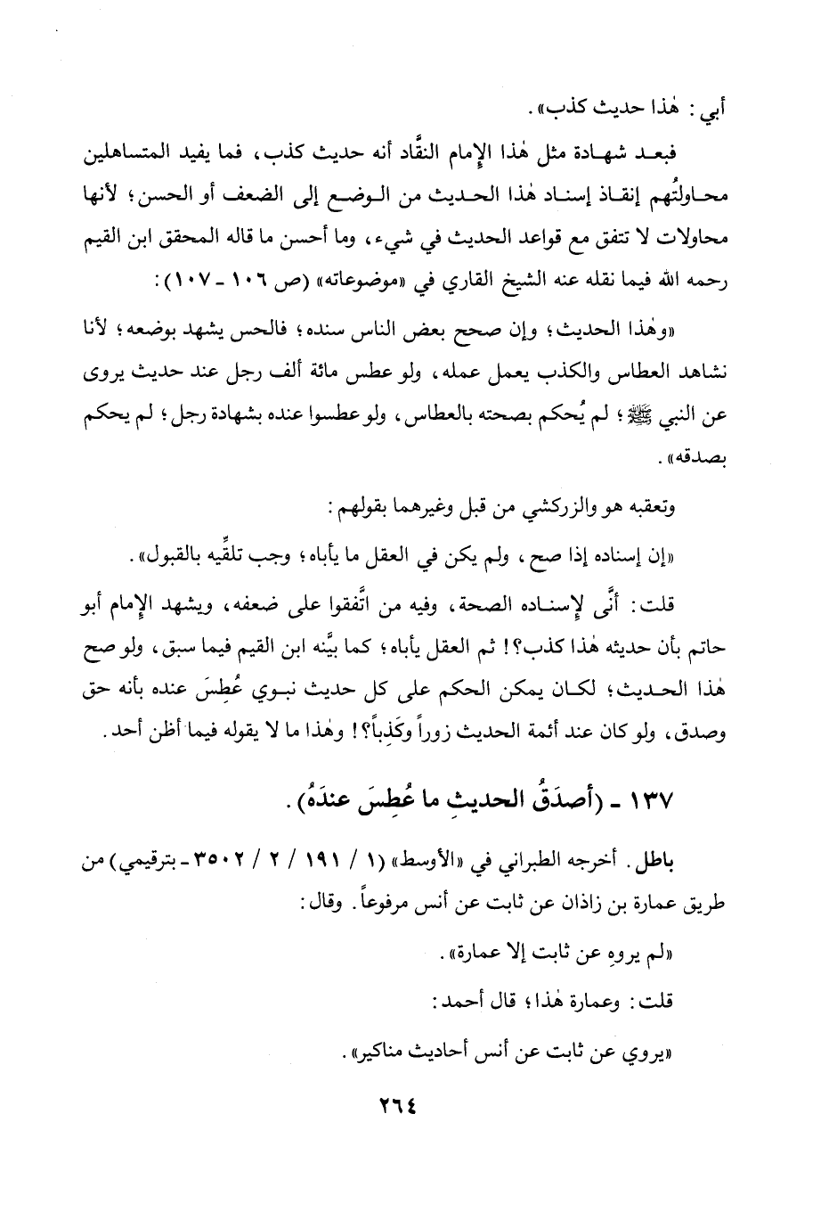 أبي: هذا حديث كذب، فبعد شهادة مثل هذا الإمام النقاد أنه حديث كذب، فما يفيد المتساهلين محاولتهم إنقاذ إسناد هذا الحديث من الوضع إلى الضعف أو الحسن لأنها محاولات لا تتفق مع قواعد الحديث في شيء، وما أحسن ما قاله المحقق ابن القيم رحمه الله فيما نقله عنه الشيخ القاري في " موضوعاته " (ص 106 ـ 107) : وهذا الحديث وإن صحح بعض الناس سنده فالحس يشهد بوضعه، لأنا نشاهد العطاس والكذب يعمل عمله، ولوعطس مئة ألف رجل عند حديث يروي عن النبي صلى الله عليه وسلم لم يحكم بصحته بالعطاس، ولوعطسوا عنده بشهادة رجل لم يحكم بصدقه، وتعقبه هو والزركشي من قبل وغيرهما بقولهم:
