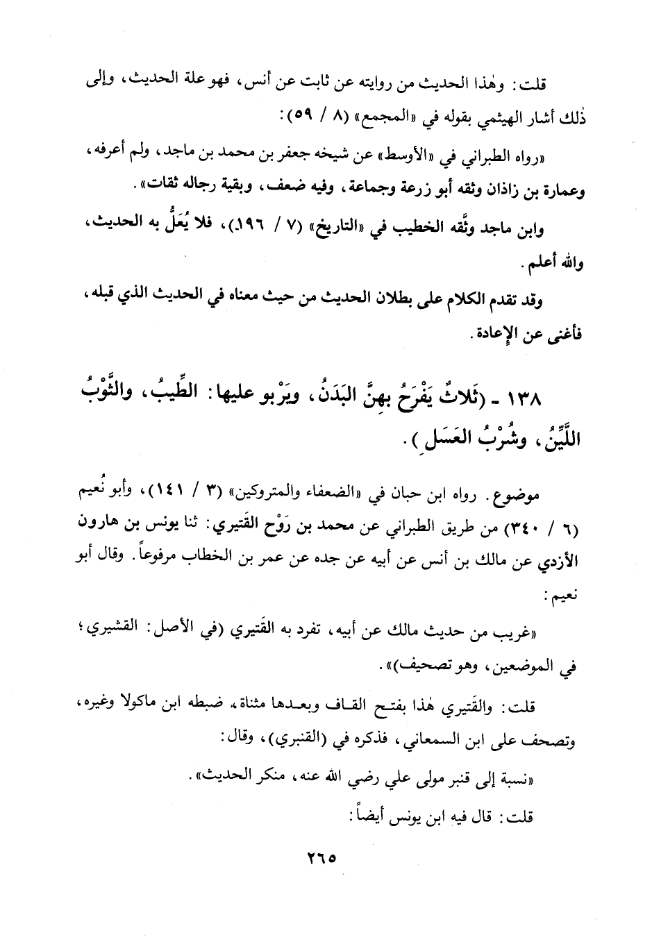 138 - " ثلاث يفرح بهن البدن ويربوعليها: الطيب، والثوب اللين، وشرب العسل ".