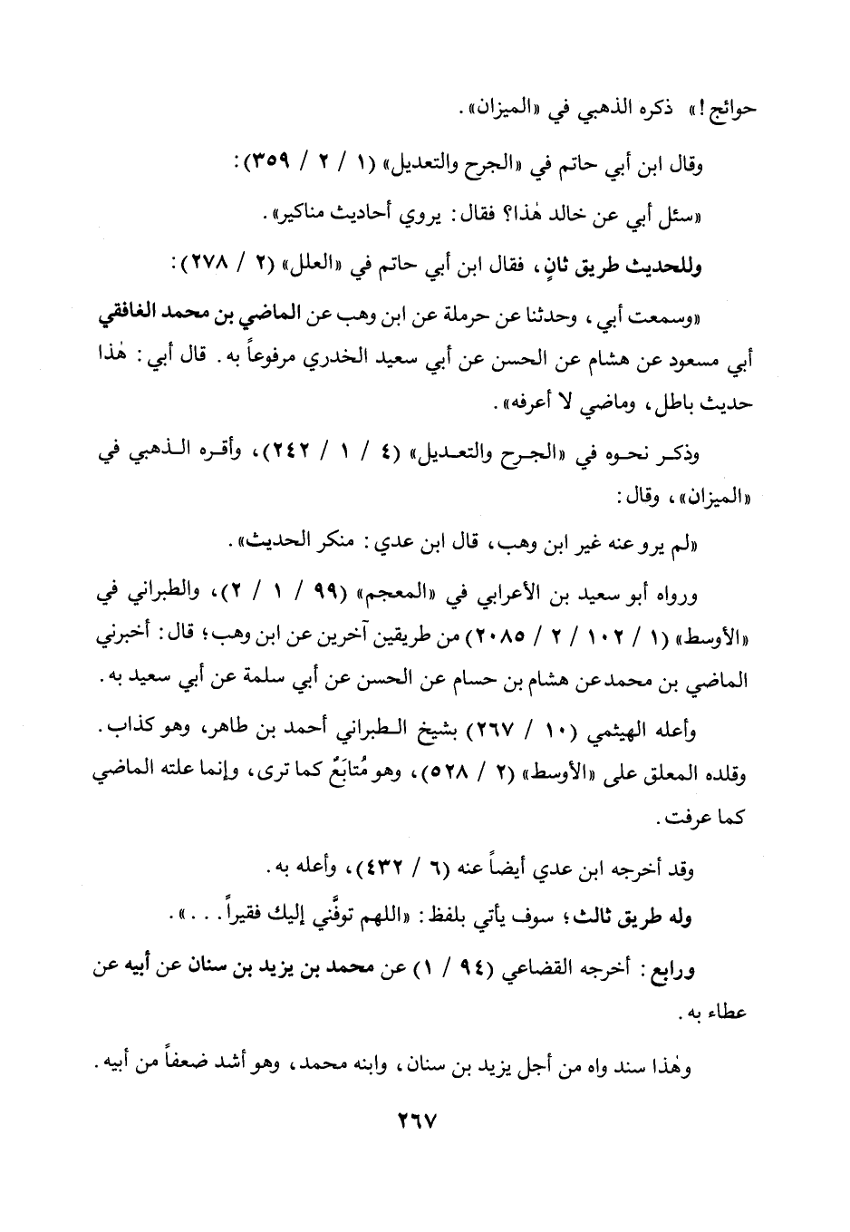 وأعله الهيثمي (10 / 267) بشيخ الطبراني أحمد بن طاهر، وهو كذاب وقلده المعلق على " الأوسط " (2 / 528) وهو متابع كما ترى وإنما علته الماضي كما عرفت، وقد أخرجه ابن عدي أيضا عنه (6 / 432) وأعله به.وله طريق ثالث سوف يأتي بلفظ: " اللهم توفني إليك فقيرا ... "، ورابع أخرجه القضاعي (94 / 1) عن محمد بن يزيد بن سنان عن أبيه عن عطاء به.