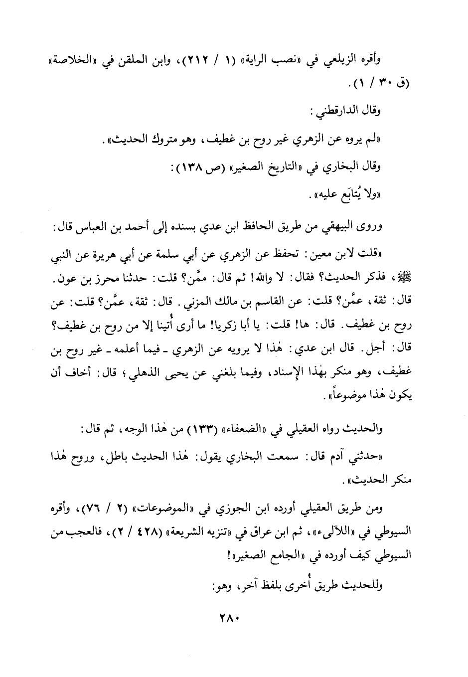 وأقره الزيلعي في " نصب الراية " (1 / 212) وابن الملقن في " الخلاصة " (ق 30 / 1) ، وقال الدارقطني: لم يروه عن الزهري غير روح بن غطيف وهو متروك الحديث، وقال البخاري في " التاريخ الصغير " (ص 138) : ولا يتابع عليه، وروى البيهقي من طريق الحافظ ابن عدي بسنده إلى أحمد بن العباس قال: قلت لابن معين: تحفظ عن الزهري عن أبي سلمة عن أبي هريرة عن النبي صلى الله عليه وسلم فذكر الحديث؟ فقال: لا والله، ثم قال: ممن؟
