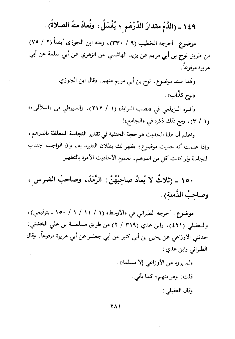 149 - " الدم مقدار الدرهم يغسل وتعاد منه الصلاة ".