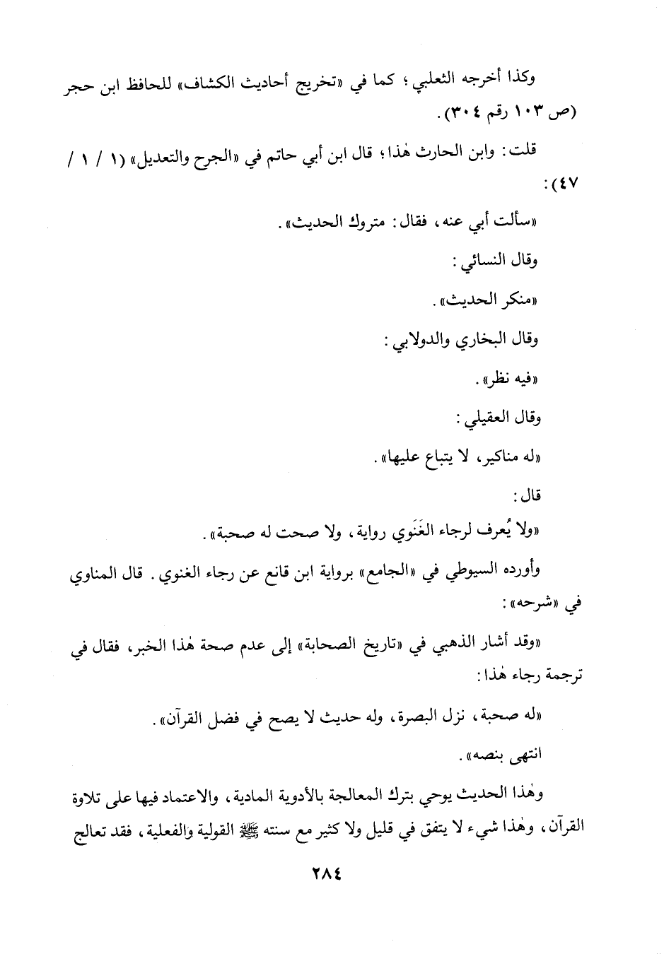 وهذا الحديث يوحي بترك المعالجة بالأدوية المادية والاعتماد فيها على تلاوة القرآن وهذا شيء لا يتفق في قليل ولا كثير مع سنته صلى الله عليه وسلم القولية والفعلية، فقد تعالج