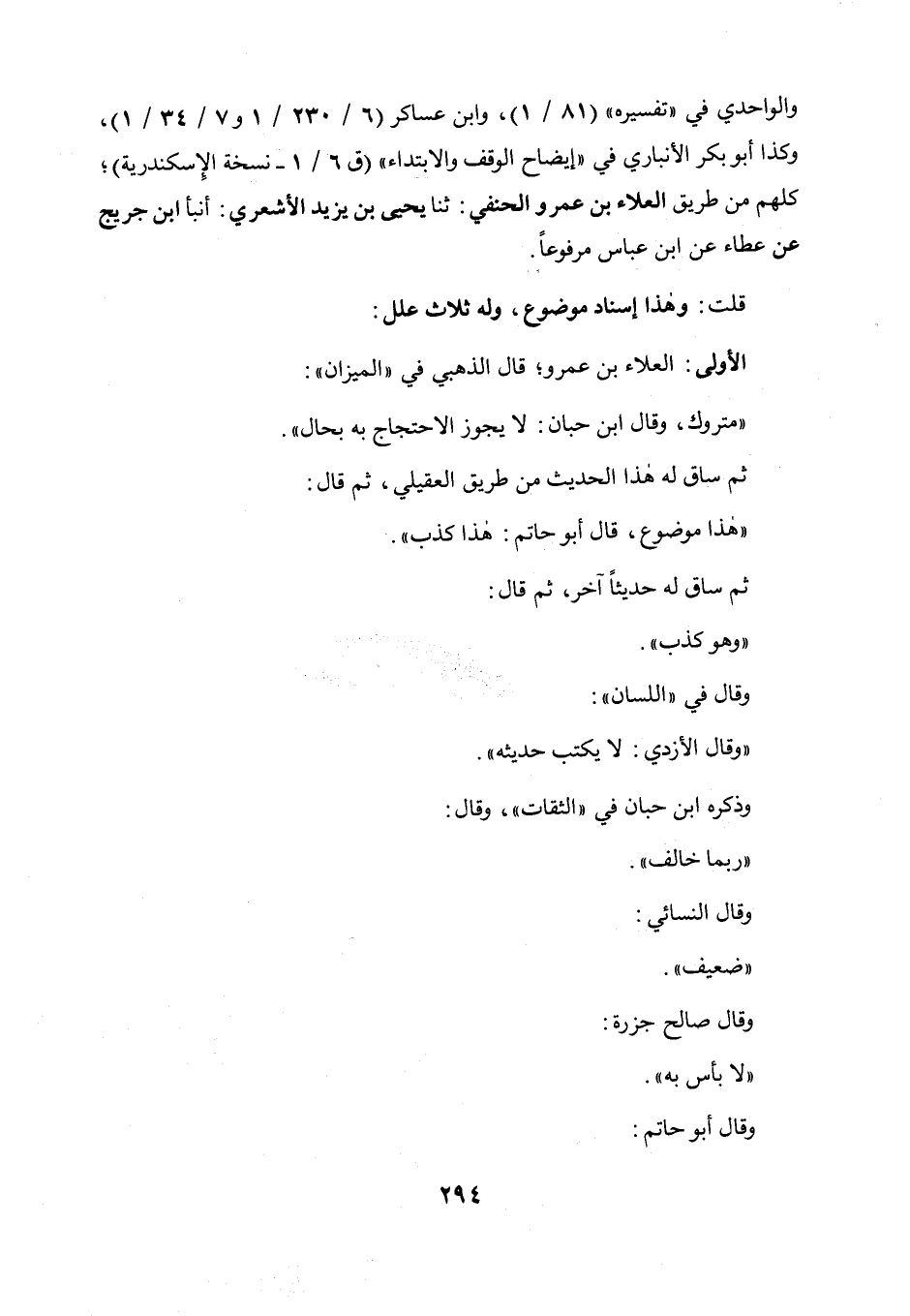 والواحدي في " تفسيره " (81 / 1) وابن عساكر (6 / 230 / 1 و7 / 34 / 1) وكذا أبو بكر الأنباري في " إيضاح الوقف والابتداء " (ق 6 / 1 نسخة الإسكندرية) كلهم من طريق العلاء بن عمرو الحنفي حدثنا يحيى بن يزيد الأشعري أنبأنا ابن جريج عن عطاء عن ابن عباس مرفوعا.