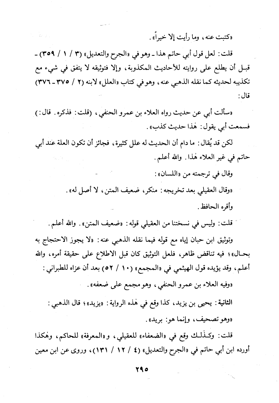 قلت: لعل قول أبي حاتم هذا وهو في " الجرح والتعديل " (3 / 1 / 359) قبل أن يطلع على روايته للأحاديث المكذوبة، وإلا فتوثيقه لا يتفق في شيء مع تكذيبه لحديثه كما نقله الذهبي عنه، وهو في كتاب " العلل " لابنه قال: (2 /375 - 376) قال: سألت أبي عن حديث رواه العلاء بن عمرو الحنفي (قلت: فذكره قال) : فسمعت أبي يقول: هذا حديث كذب.