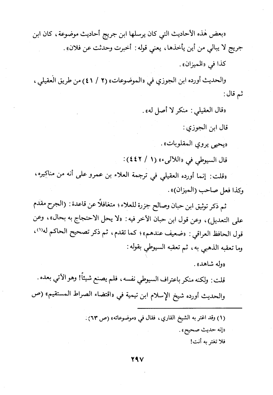 قال السيوطي في " اللآليء " (1 / 442) : قلت: إنما أورده العقيلي في ترجمة العلاء بن عمرو على أنه من مناكيره، وكذا فعل صاحب " الميزان " ثم ذكر توثيق ابن حبان وصالح جزرة للعلاء متغافلا عن قاعدة (الجرح مقدم على التعديل) وعن قول ابن حبان الآخر فيه: لا يحل الاحتجاج به بحال، وعن قول الحافظ العراقي: