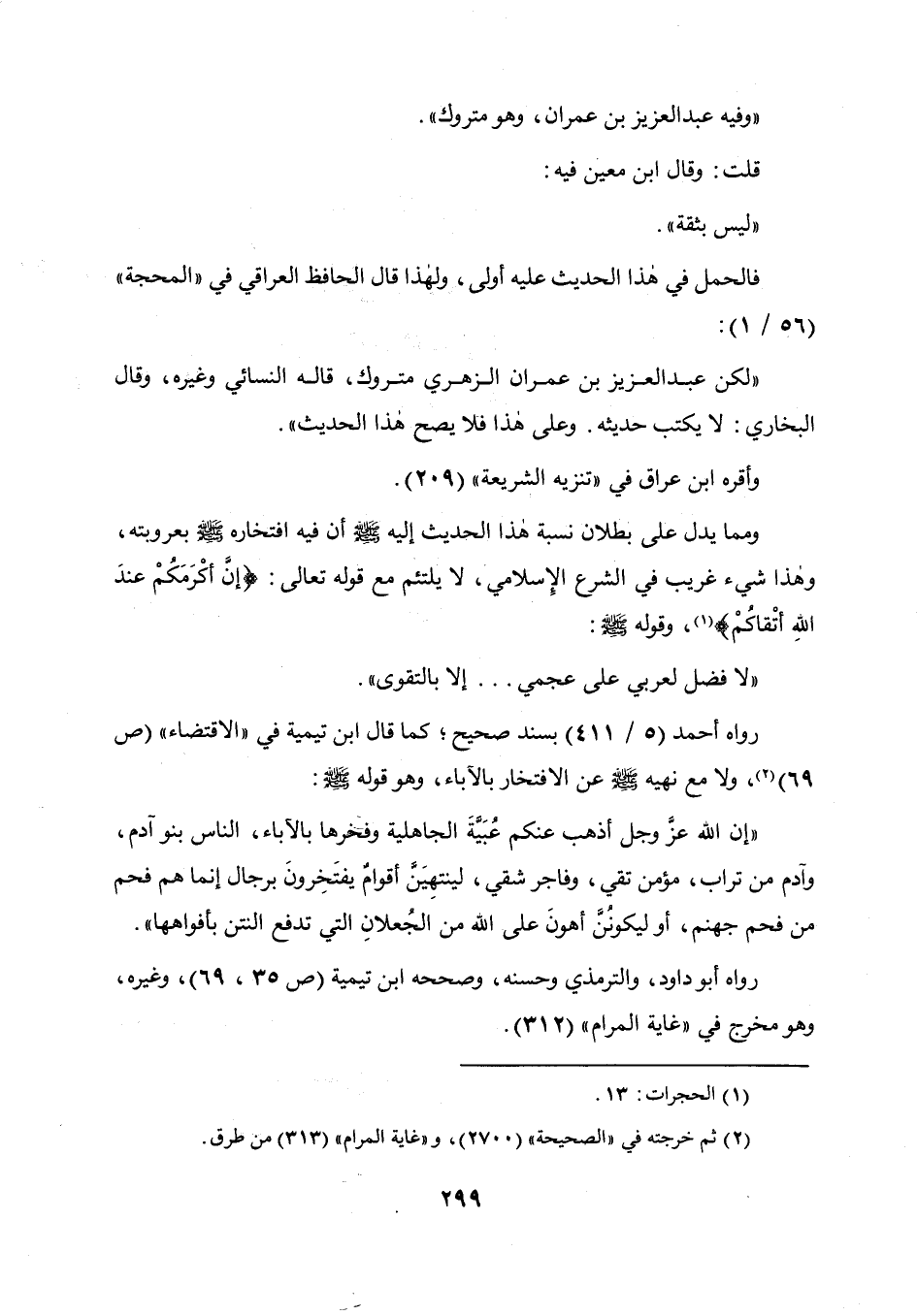 ومما يدل على بطلان نسبة هذا الحديث إليه صلى الله عليه وسلم أن فيه افتخاره صلى الله عليه وسلم بعروبته وهذا شيء غريب في الشرع الإسلامي لا يلتئم مع قوله تعالى: {إن أكرمكم عند الله أتقاكم} وقوله صلى الله عليه وسلم: " لا فضل لعربي على عجمي ... إلا بالتقوى " رواه أحمد (5 / 411) بسند صحيح كما قال ابن تيمية في " الاقتضاء " (ص 69) ولا مع نهيه صلى الله عليه وسلم عن الافتخار بالآباء وهو قوله صلى الله عليه وسلم: " إن الله عز وجل أذهب عنكم عبية الجاهلية وفخرها بالآباء، الناس بنوآدم، وآدم من تراب، مؤمن تقي وفاجر شقي، لينتهين أقوام يفتخرون برجال إنما هم فحم من فحم جهنم، أو ليكونن أهون على الله من الجعلان التي تدفع النتن بأفواها ".