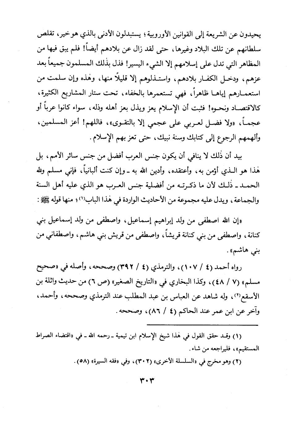 بيد أن ذلك لا ينافي أن يكون جنس العرب أفضل من جنس سائر الأمم، بل هذا هو الذي أؤمن به وأعتقده وأدين الله به - وإن كنت ألبانيا فإني مسلم ولله الحمد - ذلك لأن ما ذكرته من أفضلية جنس العرب هو الذي عليه أهل السنة والجماعة، ويدل عليه مجموعة من الأحاديث الواردة في هذا الباب منها قوله صلى الله عليه وسلم: " إن الله اصطفى من ولد إبراهيم واصطفى من ولد إسماعيل بني كنانة، واصطفى من بني كنانة قريشا، واصطفى من قريش بني هاشم واصطفاني من بني هاشم ".