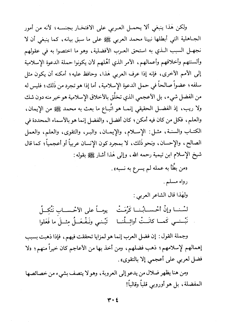 ولكن هذا ينبغي ألا يحمل العربي على الافتخار بجنسه، لأنه من أمور الجاهلية التي أبطلها نبينا محمد العربي صلى الله عليه وسلم على ما سبق بيانه، كما ينبغي أن لا نجهل السبب الذي به استحق العرب الأفضلية، وهو ما اختصوا به في عقولهم وألسنتهم وأخلاقهم وأعمالهم، الأمر الذي أهلهم لأن يكونوا حملة الدعوة الإسلامية إلى الأمم الأخرى، فإنه إذا عرف العربي هذا وحافظ عليه أمكنه أن يكون مثل سلفه عضوا صالحا في حمل الدعوة الإسلامية، أما إذا هو تجرد من ذلك فليس له من الفضل شيء، بل الأعجمي الذي تخلق بالأخلاق الإسلامية هو خير منه دون شك ولا ريب، إذ الفضل الحقيقي إنما هو اتباع ما بعث به محمد صلى الله عليه وسلم من الإيمان والعلم، فكل من كان فيه أمكن، كان أفضل، والفضل إنما هو بالأسماء المحددة في الكتاب والسنة مثل الإسلام والإيمان والبر والتقوى والعلم، والعمل الصالح والإحسان ونحوذلك، لا بمجرد كون الإنسان عربيا أو أعجميا، كما قال شيخ الإسلام ابن تيمية رحمه الله، وإلى هذا أشار صلى الله عليه وسلم بقوله: " من بطأ به عمله لم يسرع به نسبه " رواه مسلم، ولهذا قال الشاعر العربي: