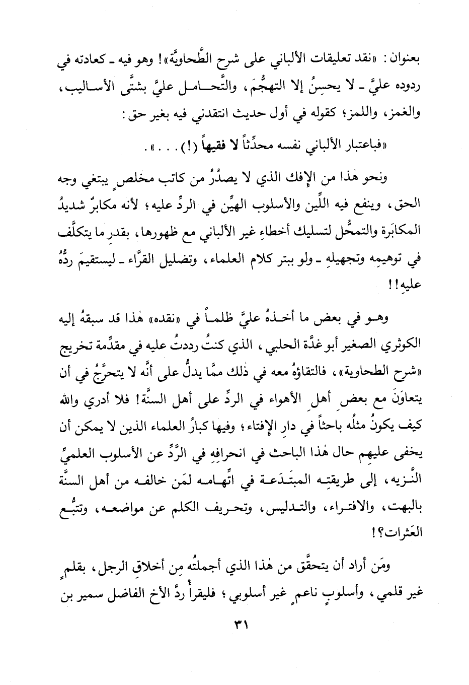 بعنوان: "نقد تعليقات الألباني على شرح الطَّحاويَّة"! وهو فيه- كعادته في ردوده عليَّ- لا يحسِنُ إلا التهجُّمَ، والتَّحامل عليَّ بشتَّى الأساليب،