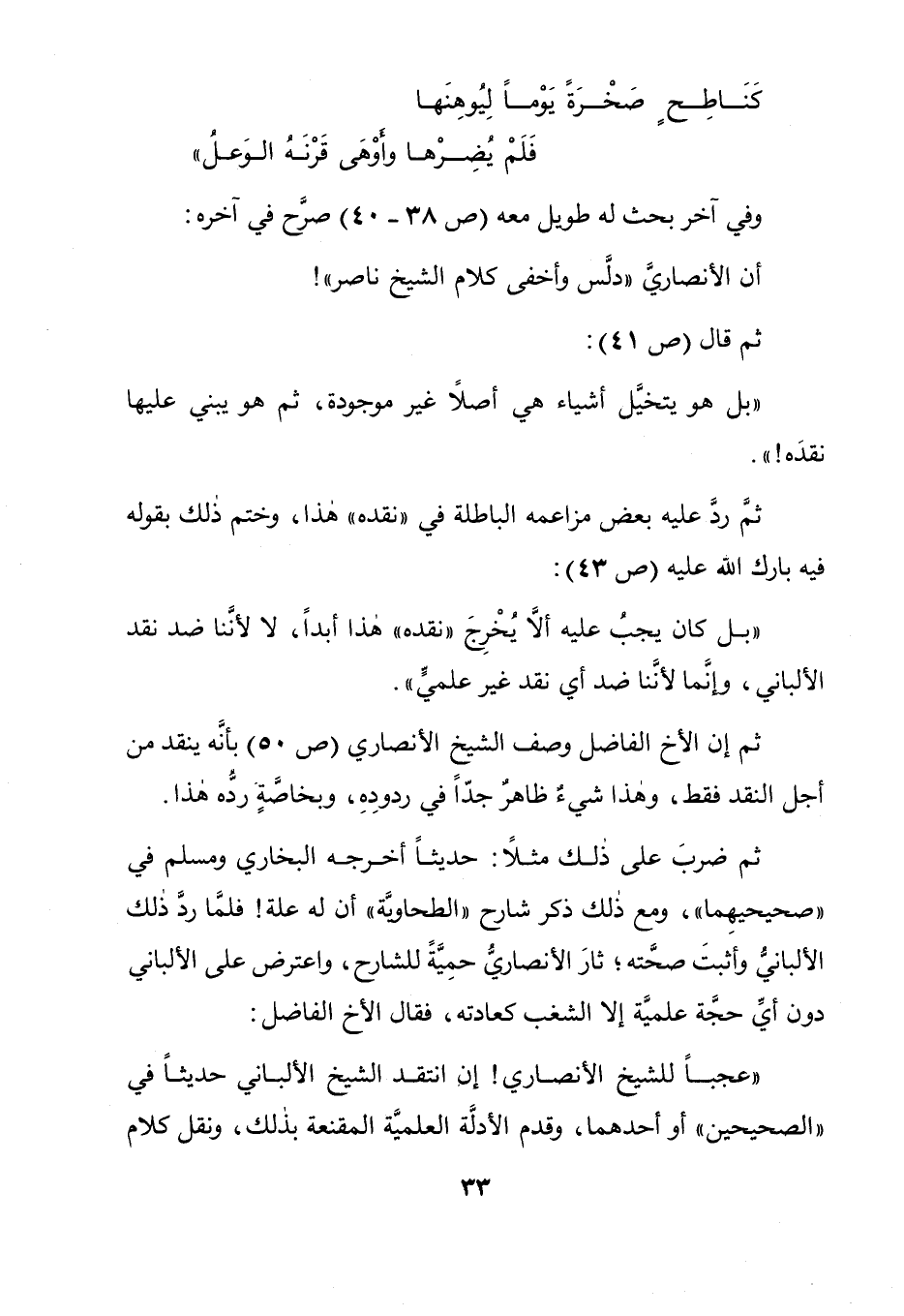 "بل كان يجبُ عليه ألَّا يُخْرِجَ " نقده " هذا أبداً، لا لأنَّنا ضد نقد الألباني، وإنَّما لأنَّنا ضد أي نقد غير علميٍّ ".