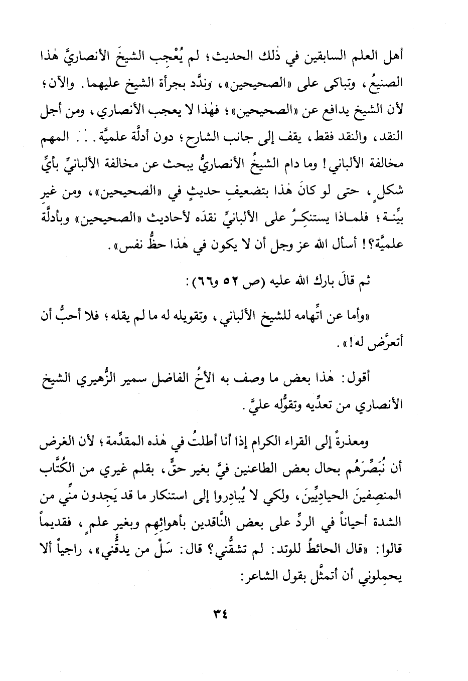 ومعذرةً إلى القراء الكرام إذا أنا أطلتُ في هذه المقدِّمة؛ لأن الغرض أن نُبَصِّرَهُم بحال بعض الطاعنين فيَّ بغير حقٍّ، بقلم غيري من الكُتَّاب المنصِفينَ الحيادِيِّينَ، ولكي لا يُبادِروا إلى استنكار ما قد يَجِدون منِّي من الشدة أحياناً في الردِّ على بعض النَّاقدين بأهوائِهِم وبغير علمٍ، فقديماً
