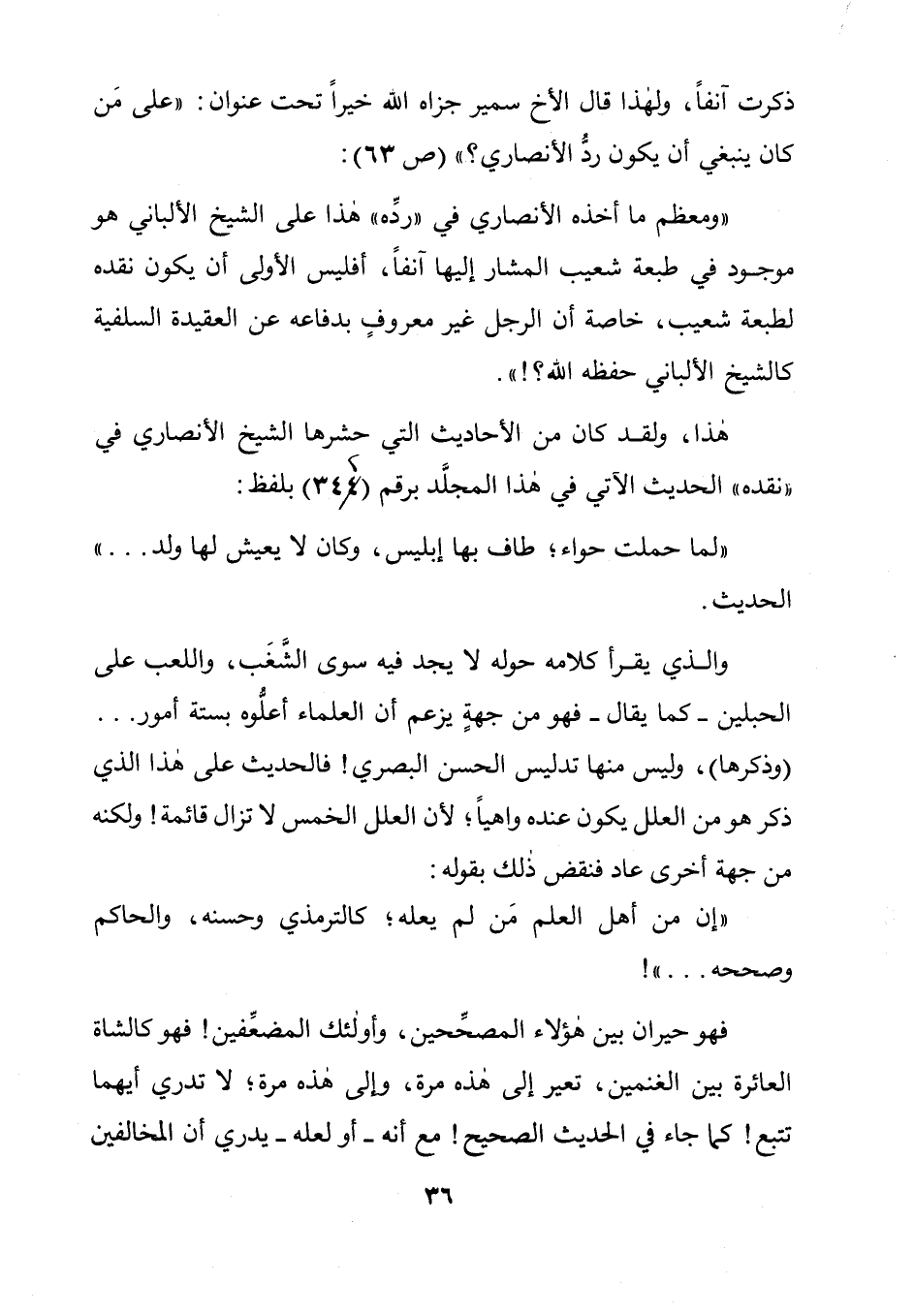 ذكرت آنفاً، ولهذا قال الأخ سمير جزاه الله خيراً تحت عنوان: "على مَن كان ينبغي أن يكون ردُ الأنصاري؟ " (ص 63) :