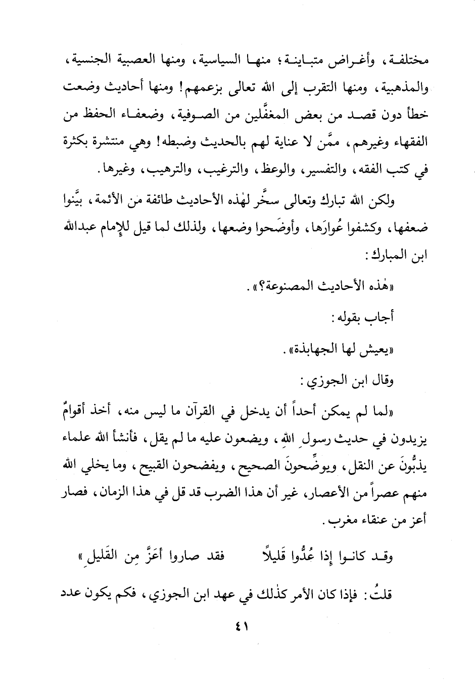 "لما لم يمكن أحداً أن يدخل في القرآن ما ليس منه، أخذ أقوامٌ يزيدون في حديث رسولِ اللهِ، ويضعون عليه ما لم يقل، فأنشأ الله علماء يذبُّونَ عن النقل، ويوضَحونَ الصحيح، ويفضحون القبيح، وما يخلي الله منهم عصراً من الأعصار، غير أن هذا الضرب قد قل في هذا الزمان، فصار أعزمن عنقاء مغرب.